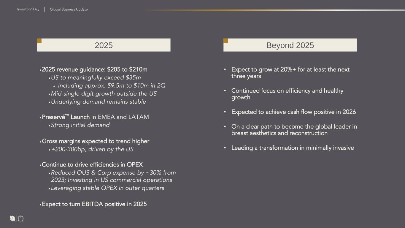 •2025 revenue guidance: $205 to $210m •US to meaningfully exceed $35m • Including approx. $9.5m to $10m in 2Q •Mid-single digit growth outside the US •Underlying demand remains stable •Preservé Launch in EMEA and LATAM •Strong initial demand •Gross margins expected to trend higher •+200-300bp, driven by the US •Continue to drive efficiencies in OPEX •Reduced OUS & Corp expense by ~30% from 2023; Investing in US commercial operations •Leveraging stable OPEX in outer quarters •Expect to turn EBITDA positive in 2025 • Expect to grow at 20%+ for at least the next three years • Continued focus on efficiency and healthy growth • Expected to achieve cash flow positive in 2026 • On a clear path to become the global leader in breast aesthetics and reconstruction • Leading a transformation in minimally invasive Global Business UpdateInvestors’ Day 2025 Beyond 2025
