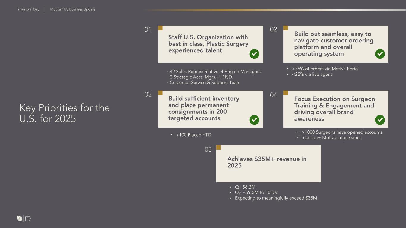 Key Priorities for the U.S. for 2025 Staff U.S. Organization with best in class, Plastic Surgery experienced talent • 42 Sales Representative, 4 Region Managers, 3 Strategic Acct. Mgrs., 1 NSD. • Customer Service & Support Team 01 Build out seamless, easy to navigate customer ordering platform and overall operating system 02 Build sufficient inventory and place permanent consignments in 200 targeted accounts • >100 Placed YTD 03 Focus Execution on Surgeon Training & Engagement and driving overall brand awareness 04 Achieves $35M+ revenue in 2025 05 • >1000 Surgeons have opened accounts • 5 billion+ Motiva impressions • Q1 $6.2M • Q2 ~$9.5M to 10.0M • Expecting to meaningfully exceed $35M Investors’ Day Motiva® US Business Update • >75% of orders via Motiva Portal • <25% via live agent