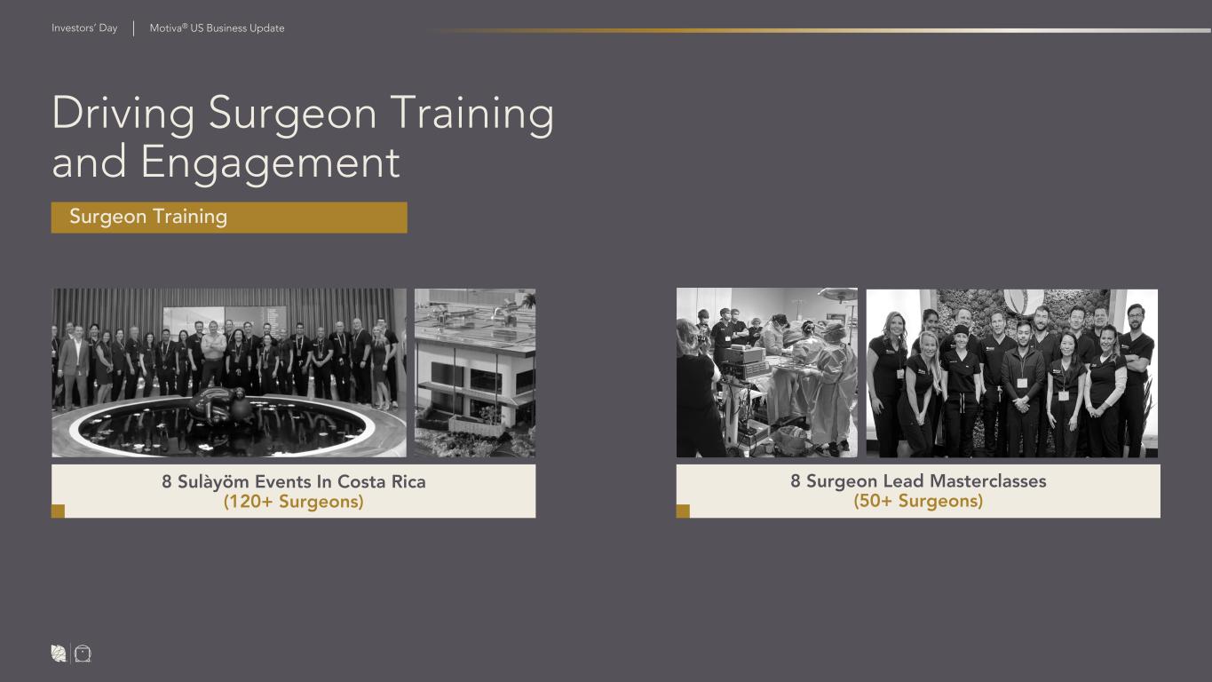 8 Sulàyöm Events In Costa Rica (120+ Surgeons) 8 Surgeon Lead Masterclasses (50+ Surgeons) Surgeon Training Investors’ Day Driving Surgeon Training and Engagement Motiva® US Business Update