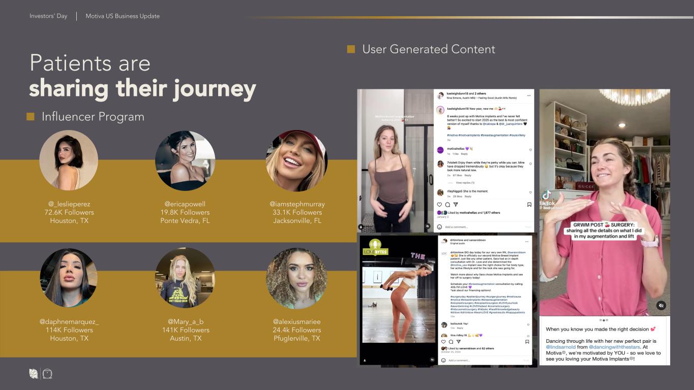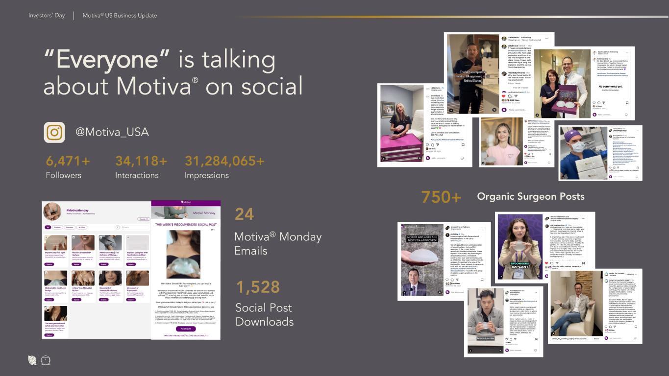 “Everyone” is talking about Motiva® on social @Motiva_USA 6,471+ 34,118+ 31,284,065+ Followers Interactions Impressions 750+ Organic Surgeon Posts 24 Motiva® Monday Emails 1,528 Social Post Downloads Investors’ Day Motiva® US Business Update