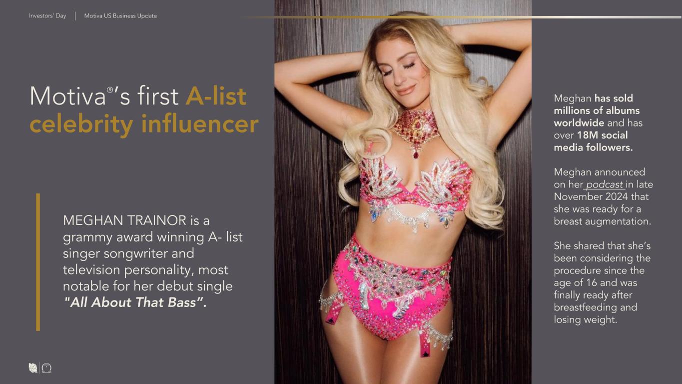 Motiva®’s first A-list celebrity influencer MEGHAN TRAINOR is a grammy award winning A- list singer songwriter and television personality, most notable for her debut single "All About That Bass”. Meghan has sold millions of albums worldwide and has over 18M social media followers. Meghan announced on her podcast in late November 2024 that she was ready for a breast augmentation. She shared that she’s been considering the procedure since the age of 16 and was finally ready after breastfeeding and losing weight. Motiva US Business UpdateInvestors’ Day