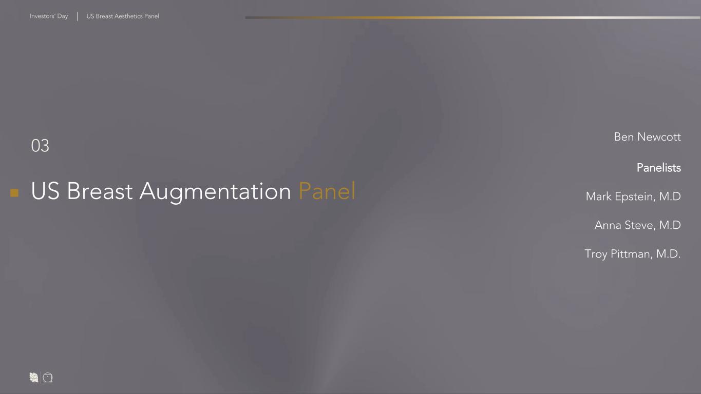 Investors’ Day US Breast Aesthetics Panel 03 US Breast Augmentation Panel Ben Newcott Panelists Mark Epstein, M.D Anna Steve, M.D Troy Pittman, M.D.
