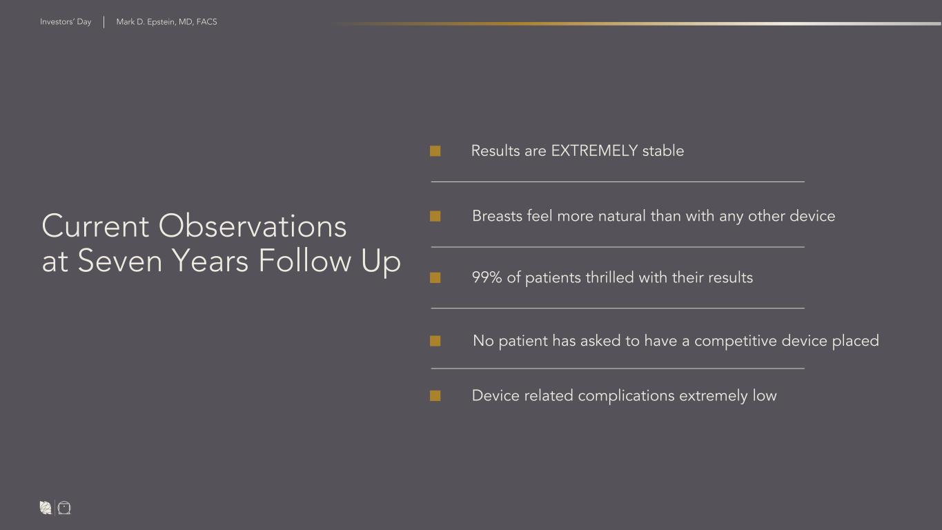 Current Observations at Seven Years Follow Up Results are EXTREMELY stable Breasts feel more natural than with any other device 99% of patients thrilled with their results No patient has asked to have a competitive device placed Device related complications extremely low Investors’ Day Mark D. Epstein, MD, FACS