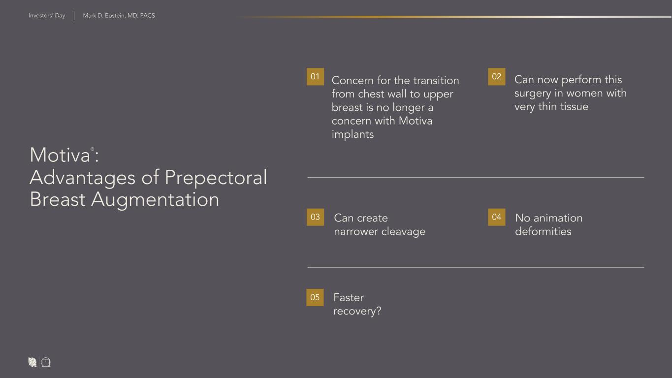 Motiva®: Advantages of Prepectoral Breast Augmentation Concern for the transition from chest wall to upper breast is no longer a concern with Motiva implants Can now perform this surgery in women with very thin tissue No animation deformities Can create narrower cleavage Faster recovery? 01 02 03 04 05 Investors’ Day Mark D. Epstein, MD, FACS