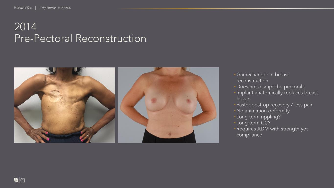 2014 Pre-Pectoral Reconstruction •Gamechanger in breast reconstruction •Does not disrupt the pectoralis • Implant anatomically replaces breast tissue •Faster post-op recovery / less pain •No animation deformity •Long term rippling? •Long term CC? •Requires ADM with strength yet compliance Investors’ Day Troy Pittman, MD FACS