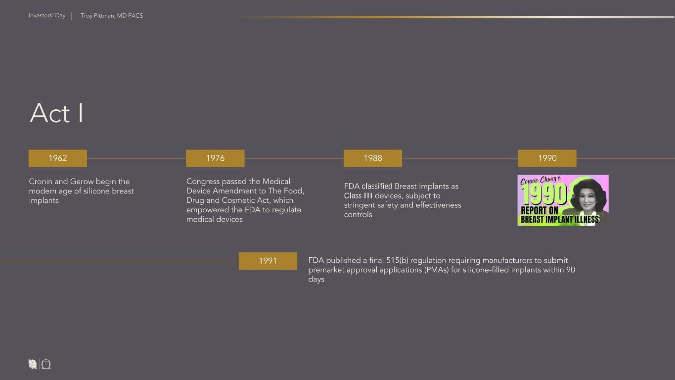 Act I 1962 Cronin and Gerow begin the modern age of silicone breast implants 1976 Congress passed the Medical Device Amendment to The Food, Drug and Cosmetic Act, which empowered the FDA to regulate medical devices 1988 FDA classified Breast Implants as Class III devices, subject to stringent safety and effectiveness controls 1990 1991 FDA published a final 515(b) regulation requiring manufacturers to submit premarket approval applications (PMAs) for silicone-filled implants within 90 days Investors’ Day Troy Pittman, MD FACS