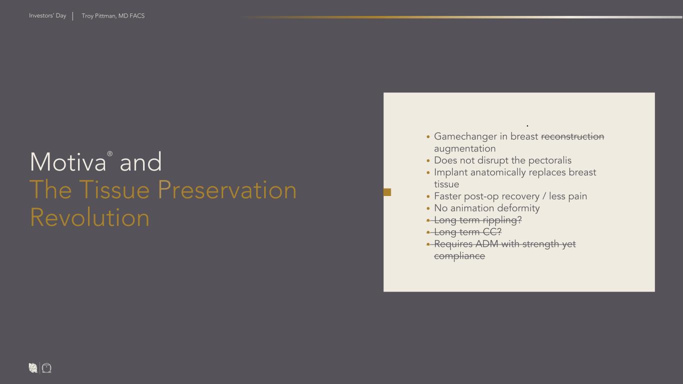 Motiva® and The Tissue Preservation Revolution • Gamechanger in breast reconstruction augmentation • Does not disrupt the pectoralis • Implant anatomically replaces breast tissue • Faster post-op recovery / less pain • No animation deformity • Long term rippling? • Long term CC? • Requires ADM with strength yet compliance Investors’ Day Troy Pittman, MD FACS
