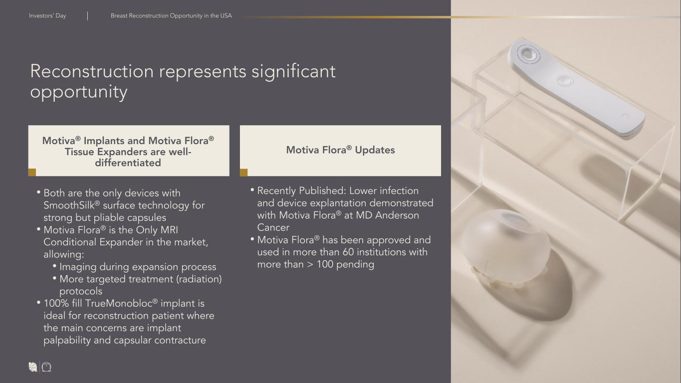 • Recently Published: Lower infection and device explantation demonstrated with Motiva Flora® at MD Anderson Cancer • Motiva Flora® has been approved and used in more than 60 institutions with more than > 100 pending Motiva® Implants and Motiva Flora® Tissue Expanders are well- differentiated Motiva Flora® Updates • Both are the only devices with SmoothSilk® surface technology for strong but pliable capsules • Motiva Flora® is the Only MRI Conditional Expander in the market, allowing: • Imaging during expansion process • More targeted treatment (radiation) protocols • 100% fill TrueMonobloc® implant is ideal for reconstruction patient where the main concerns are implant palpability and capsular contracture Investors’ Day Breast Reconstruction Opportunity in the USA Reconstruction represents significant opportunity