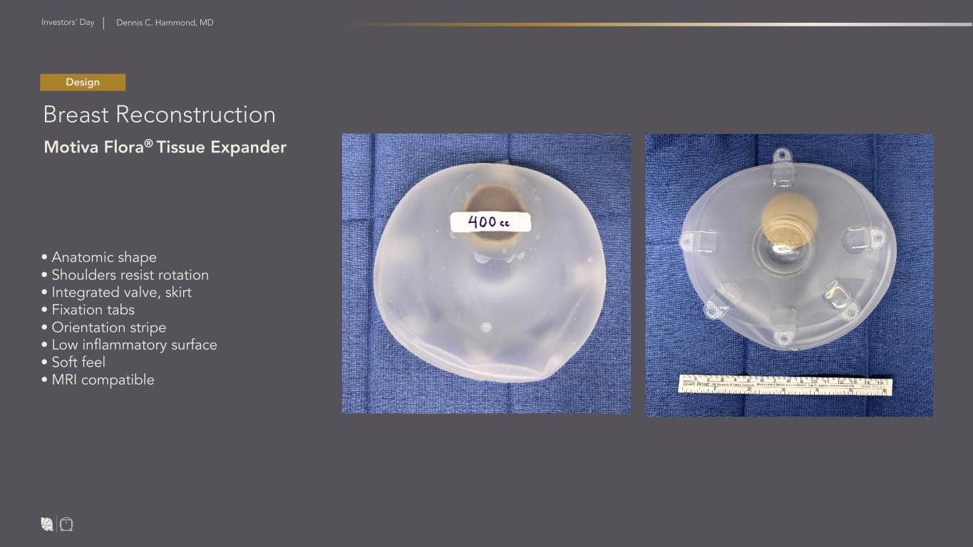 • Anatomic shape • Shoulders resist rotation • Integrated valve, skirt • Fixation tabs • Orientation stripe • Low inflammatory surface • Soft feel • MRI compatible Design Breast Reconstruction Motiva Flora® Tissue Expander Investors’ Day Dennis C. Hammond, MD