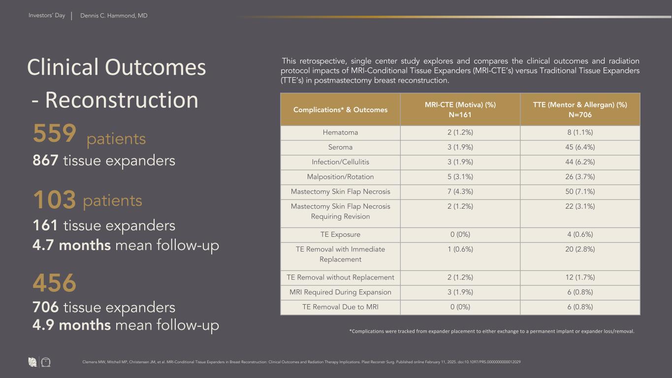 - Reconstruction Clemens MW, Mitchell MP, Christensen JM, et al. MRI-Conditional Tissue Expanders in Breast Reconstruction: Clinical Outcomes and Radiation Therapy Implications. Plast Reconstr Surg. Published online February 11, 2025. doi:10.1097/PRS.0000000000012029 Clinical Outcomes This retrospective, single center study explores and compares the clinical outcomes and radiation protocol impacts of MRI-Conditional Tissue Expanders (MRI-CTE’s) versus Traditional Tissue Expanders (TTE’s) in postmastectomy breast reconstruction. *Complications were tracked from expander placement to either exchange to a permanent implant or expander loss/removal. 867 tissue expanders patients559 456 706 tissue expanders 4.9 months mean follow-up 103 161 tissue expanders 4.7 months mean follow-up Complications* & Outcomes MRI-CTE (Motiva) (%) N=161 TTE (Mentor & Allergan) (%) N=706 Hematoma 2 (1.2%) 8 (1.1%) Seroma 3 (1.9%) 45 (6.4%) Infection/Cellulitis 3 (1.9%) 44 (6.2%) Malposition/Rotation 5 (3.1%) 26 (3.7%) Mastectomy Skin Flap Necrosis 7 (4.3%) 50 (7.1%) Mastectomy Skin Flap Necrosis Requiring Revision 2 (1.2%) 22 (3.1%) TE Exposure 0 (0%) 4 (0.6%) TE Removal with Immediate Replacement 1 (0.6%) 20 (2.8%) TE Removal without Replacement 2 (1.2%) 12 (1.7%) MRI Required During Expansion 3 (1.9%) 6 (0.8%) TE Removal Due to MRI 0 (0%) 6 (0.8%) patients Investors’ Day Dennis C. Hammond, MD