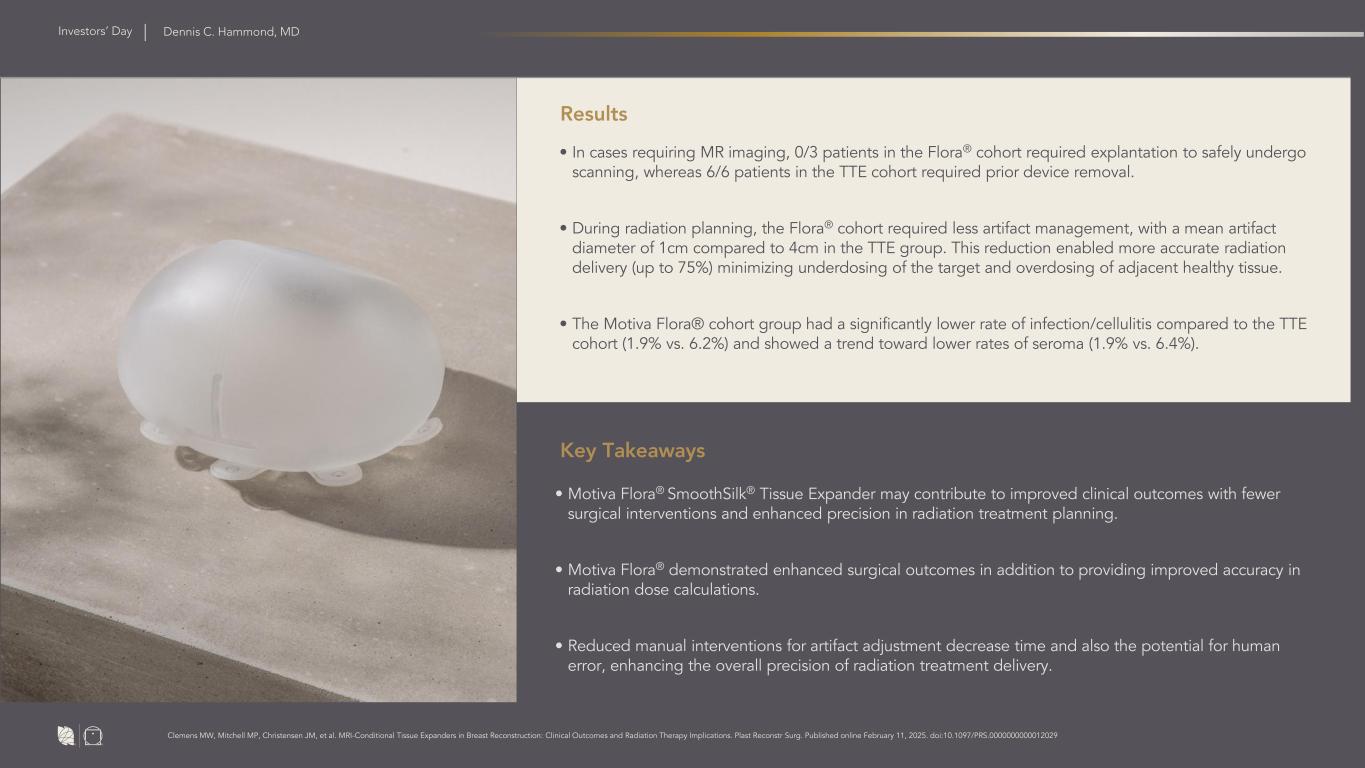 • In cases requiring MR imaging, 0/3 patients in the Flora® cohort required explantation to safely undergo scanning, whereas 6/6 patients in the TTE cohort required prior device removal. • During radiation planning, the Flora® cohort required less artifact management, with a mean artifact diameter of 1cm compared to 4cm in the TTE group. This reduction enabled more accurate radiation delivery (up to 75%) minimizing underdosing of the target and overdosing of adjacent healthy tissue. • The Motiva Flora® cohort group had a significantly lower rate of infection/cellulitis compared to the TTE cohort (1.9% vs. 6.2%) and showed a trend toward lower rates of seroma (1.9% vs. 6.4%). Results Key Takeaways • Motiva Flora® SmoothSilk® Tissue Expander may contribute to improved clinical outcomes with fewer surgical interventions and enhanced precision in radiation treatment planning. • Motiva Flora® demonstrated enhanced surgical outcomes in addition to providing improved accuracy in radiation dose calculations. • Reduced manual interventions for artifact adjustment decrease time and also the potential for human error, enhancing the overall precision of radiation treatment delivery. Clemens MW, Mitchell MP, Christensen JM, et al. MRI-Conditional Tissue Expanders in Breast Reconstruction: Clinical Outcomes and Radiation Therapy Implications. Plast Reconstr Surg. Published online February 11, 2025. doi:10.1097/PRS.0000000000012029 Investors’ Day Dennis C. Hammond, MD