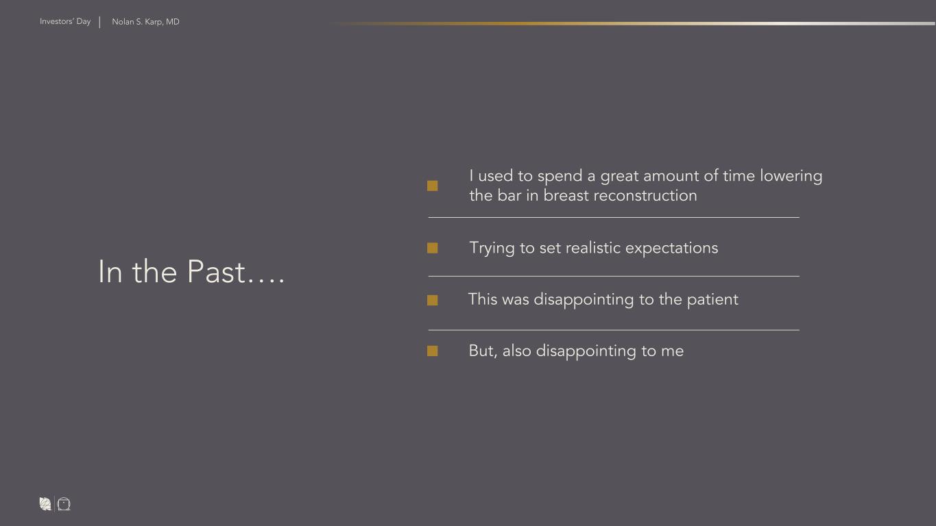 In the Past…. I used to spend a great amount of time lowering the bar in breast reconstruction Trying to set realistic expectations This was disappointing to the patient But, also disappointing to me Investors’ Day Nolan S. Karp, MD