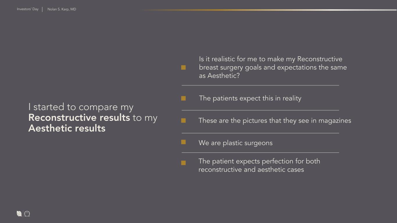 I started to compare my Reconstructive results to my Aesthetic results Is it realistic for me to make my Reconstructive breast surgery goals and expectations the same as Aesthetic? The patients expect this in reality These are the pictures that they see in magazines We are plastic surgeons The patient expects perfection for both reconstructive and aesthetic cases Investors’ Day Nolan S. Karp, MD
