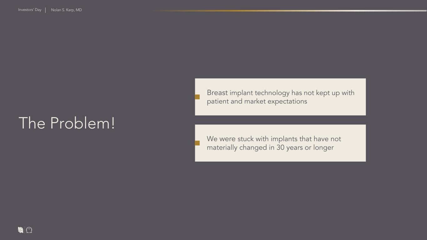 The Problem! Breast implant technology has not kept up with patient and market expectations We were stuck with implants that have not materially changed in 30 years or longer Investors’ Day Nolan S. Karp, MD