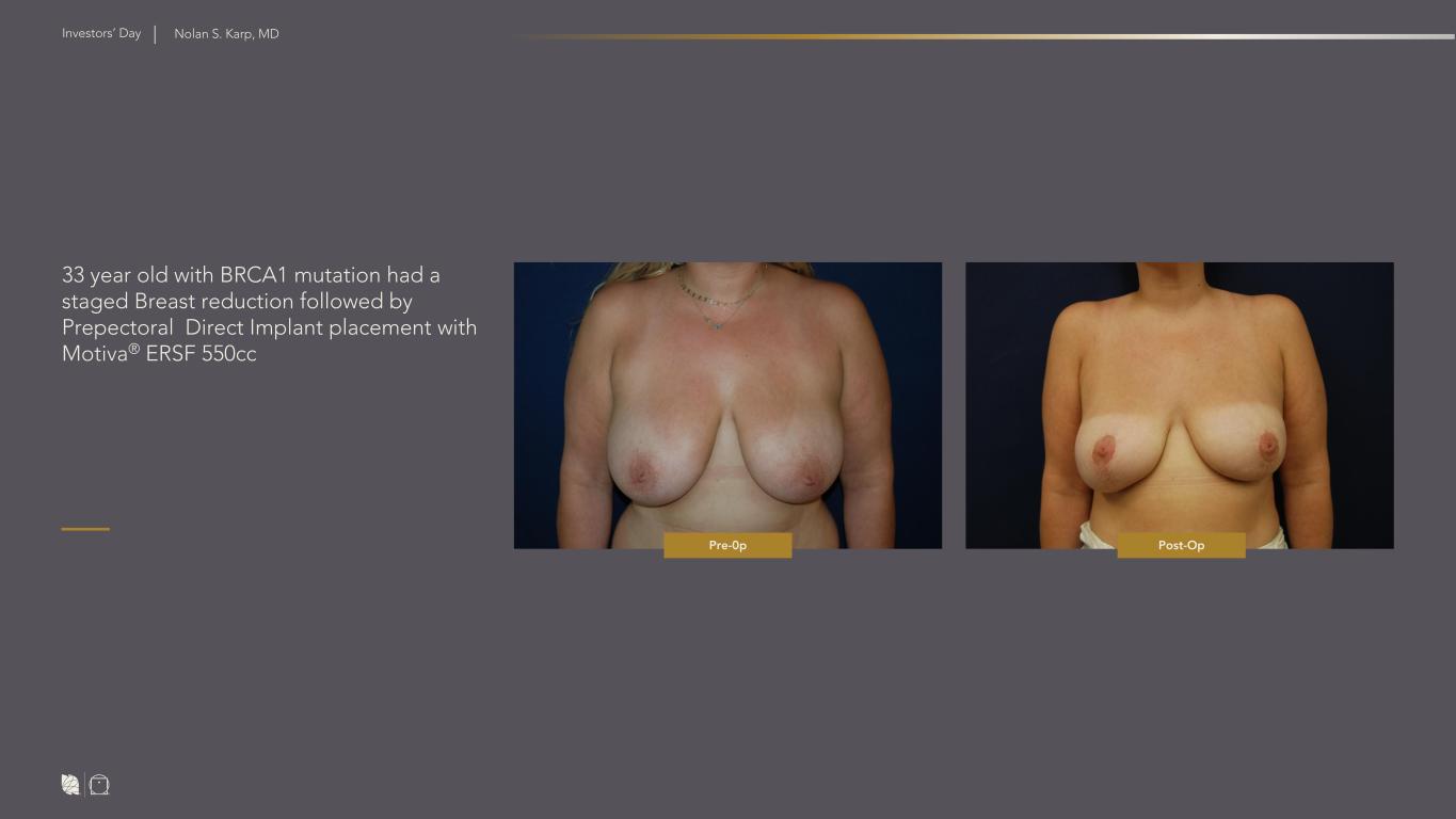 33 year old with BRCA1 mutation had a staged Breast reduction followed by Prepectoral Direct Implant placement with Motiva® ERSF 550cc Post-OpPre-0p Investors’ Day Nolan S. Karp, MD