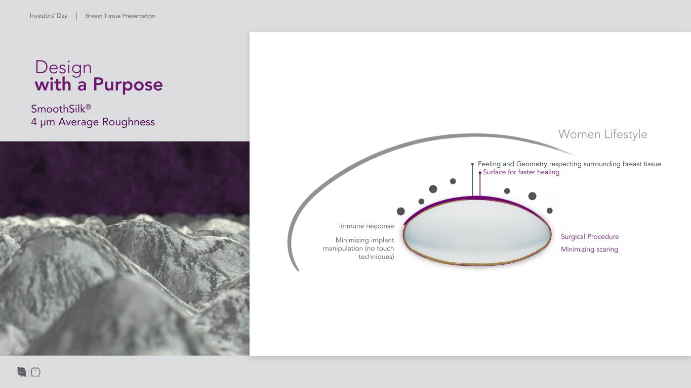 Feeling and Geometry respecting surrounding breast tissue Surface for faster healing Immune response Minimizing implant manipulation (no touch techniques) Surgical Procedure Minimizing scaring Women Lifestyle Design with a Purpose SmoothSilk® 4 µm Average Roughness Investors’ Day Breast Tissue Preservation