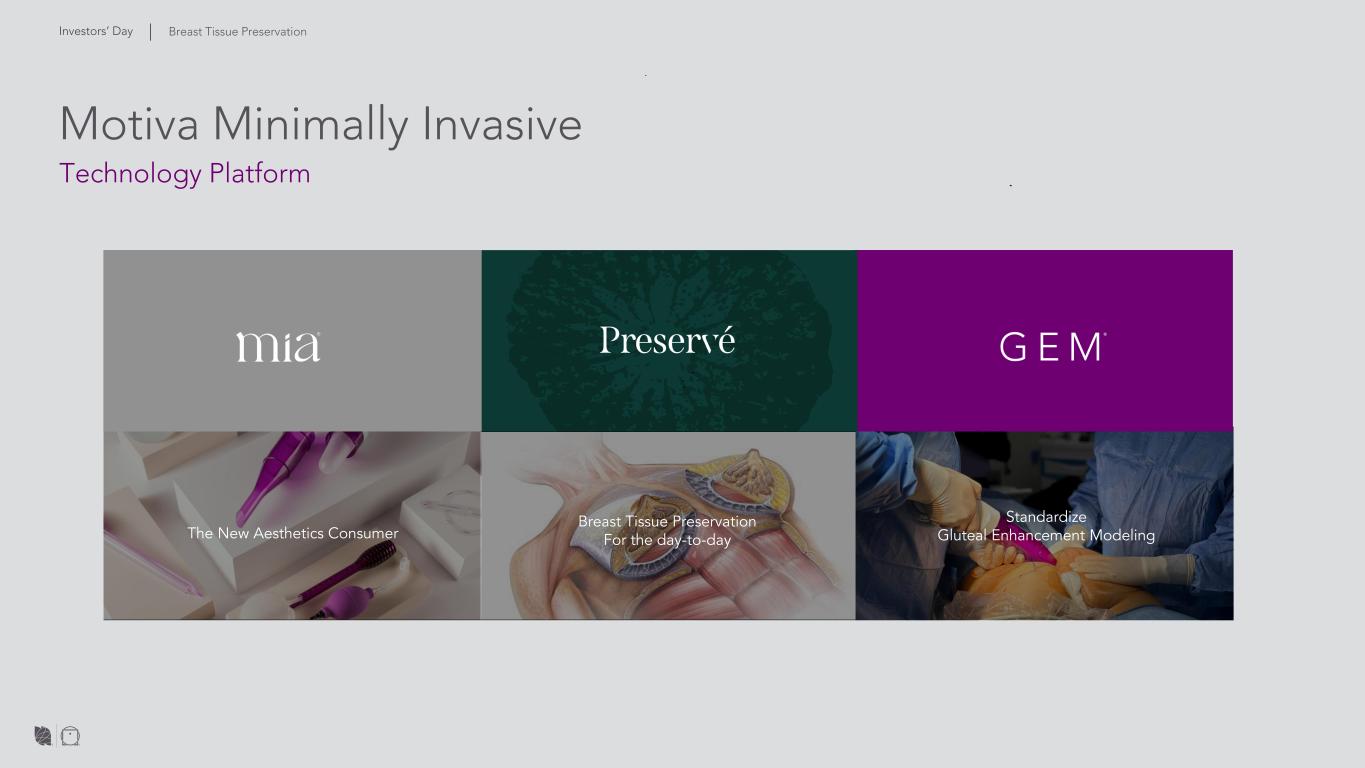 Motiva Minimally Invasive Technology Platform Investors’ Day The New Aesthetics Consumer Breast Tissue Preservation For the day-to-day Standardize Gluteal Enhancement Modeling Breast Tissue Preservation