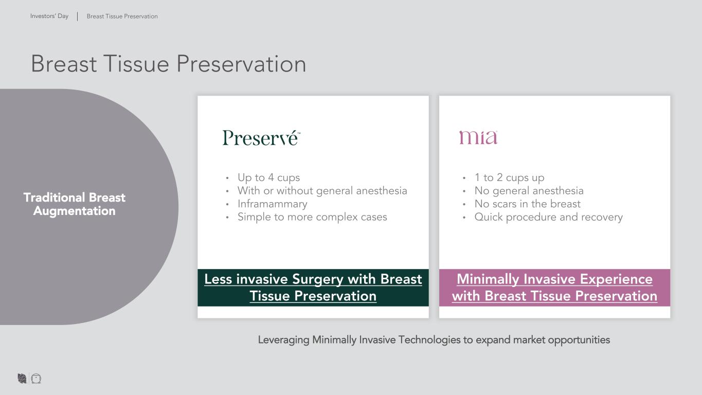 Investors’ Day Breast Tissue Preservation Breast Tissue Preservation Less invasive Surgery with Breast Tissue Preservation Minimally Invasive Experience with Breast Tissue Preservation • 1 to 2 cups up • No general anesthesia • No scars in the breast • Quick procedure and recovery • Up to 4 cups • With or without general anesthesia • Inframammary • Simple to more complex cases Traditional Breast Augmentation Leveraging Minimally Invasive Technologies to expand market opportunities