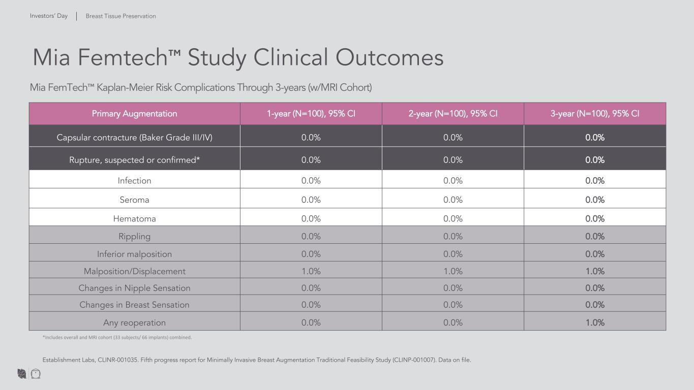 Investors’ Day Breast Tissue Preservation Mia Femtech Study Clinical Outcomes Primary Augmentation 1-year (N=100), 95% CI 2-year (N=100), 95% CI 3-year (N=100), 95% CI Capsular contracture (Baker Grade III/IV) 0.0% 0.0% 0.0% Rupture, suspected or confirmed* 0.0% 0.0% 0.0% Infection 0.0% 0.0% 0.0% Seroma 0.0% 0.0% 0.0% Hematoma 0.0% 0.0% 0.0% Rippling 0.0% 0.0% 0.0% Inferior malposition 0.0% 0.0% 0.0% Malposition/Displacement 1.0% 1.0% 1.0% Changes in Nipple Sensation 0.0% 0.0% 0.0% Changes in Breast Sensation 0.0% 0.0% 0.0% Any reoperation 0.0% 0.0% 1.0% Mia FemTech Kaplan-Meier Risk Complications Through 3-years (w/MRI Cohort) *Includes overall and MRI cohort (33 subjects/ 66 implants) combined. Establishment Labs, CLINR-001035. Fifth progress report for Minimally Invasive Breast Augmentation Traditional Feasibility Study (CLINP-001007). Data on file.