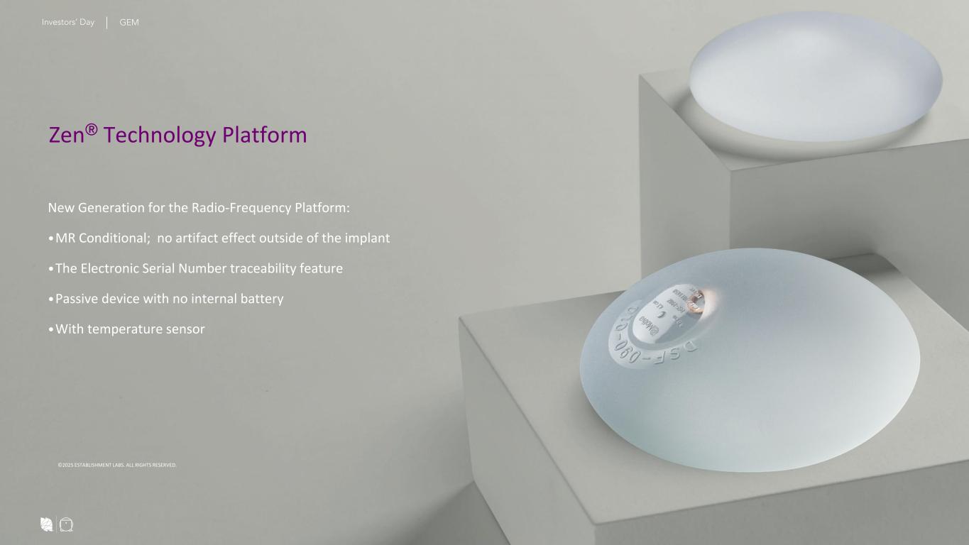 ©2025 ESTABLISHMENT LABS. ALL RIGHTS RESERVED. New Generation for the Radio-Frequency Platform: •MR Conditional; no artifact effect outside of the implant •The Electronic Serial Number traceability feature •Passive device with no internal battery •With temperature sensor Investors’ Day GEM Zen® Technology Platform