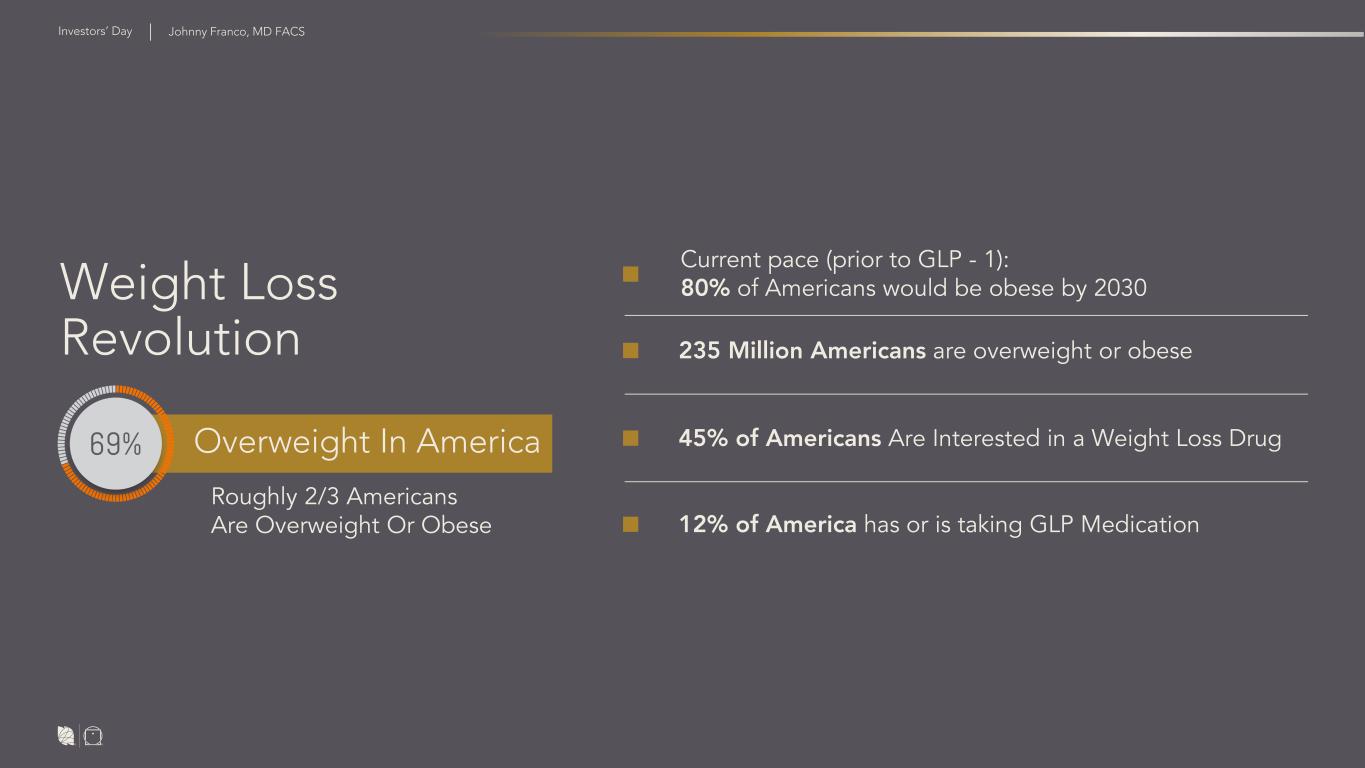 Weight Loss Revolution Roughly 2/3 Americans Are Overweight Or Obese Current pace (prior to GLP - 1): 80% of Americans would be obese by 2030 235 Million Americans are overweight or obese 45% of Americans Are Interested in a Weight Loss Drug 12% of America has or is taking GLP Medication Overweight In America Johnny Franco, MD FACSInvestors’ Day