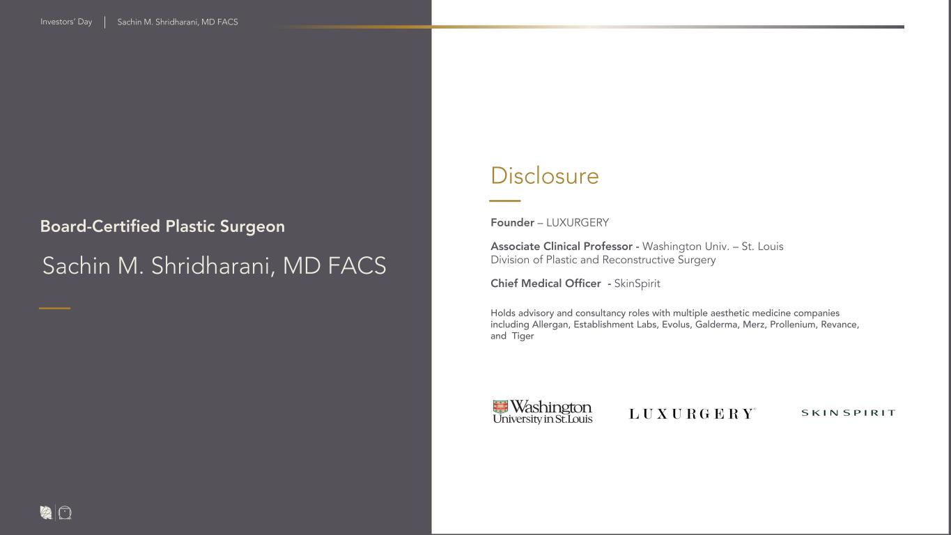 Founder – LUXURGERY Associate Clinical Professor - Washington Univ. – St. Louis Division of Plastic and Reconstructive Surgery Chief Medical Officer - SkinSpirit Board-Certified Plastic Surgeon Sachin M. Shridharani, MD FACS Disclosure Holds advisory and consultancy roles with multiple aesthetic medicine companies including Allergan, Establishment Labs, Evolus, Galderma, Merz, Prollenium, Revance, and Tiger Sachin M. Shridharani, MD FACSInvestors’ Day