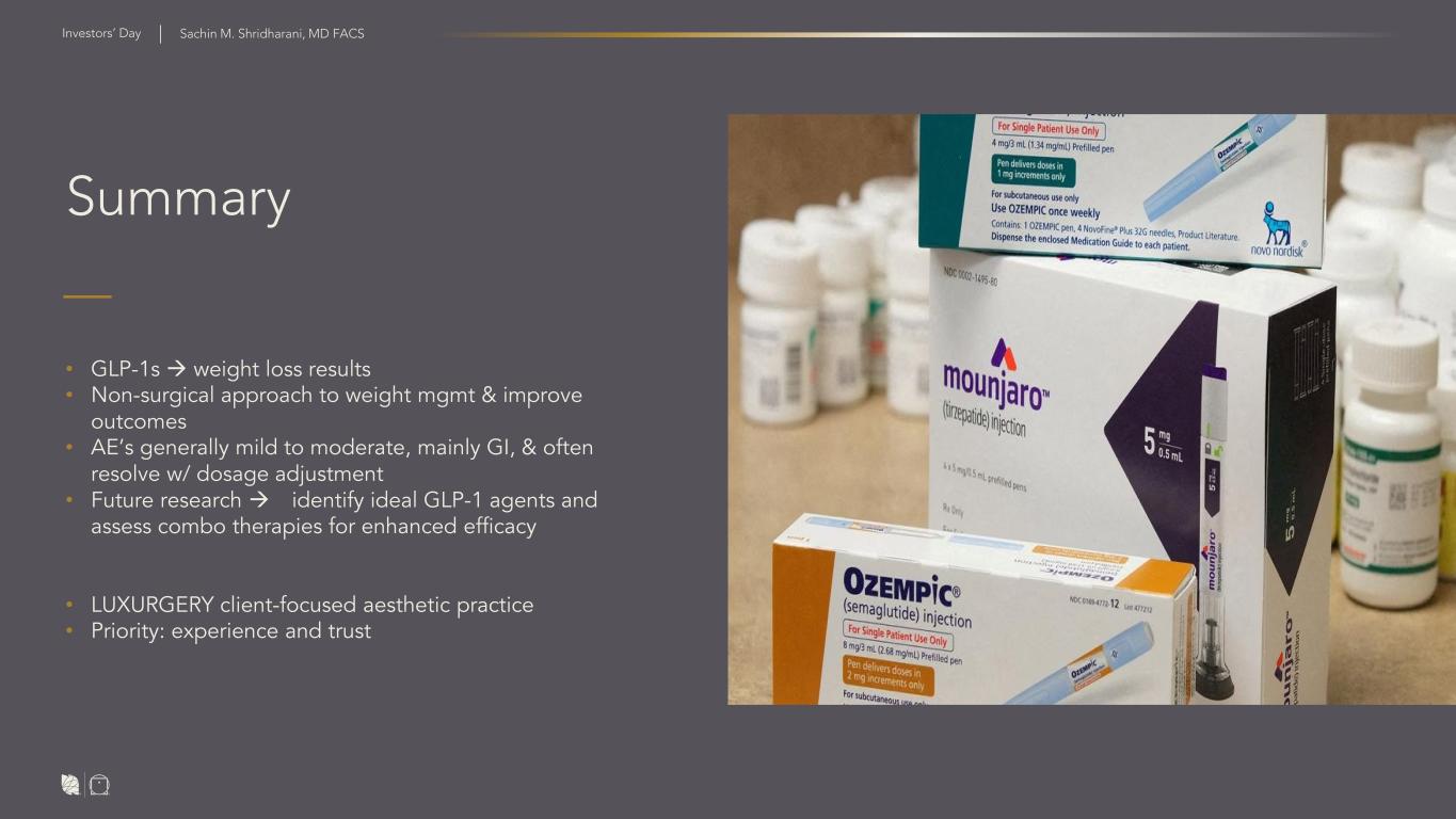 Summary • GLP-1s → weight loss results • Non-surgical approach to weight mgmt & improve outcomes • AE’s generally mild to moderate, mainly GI, & often resolve w/ dosage adjustment • Future research → identify ideal GLP-1 agents and assess combo therapies for enhanced efficacy • LUXURGERY client-focused aesthetic practice • Priority: experience and trust Sachin M. Shridharani, MD FACSInvestors’ Day