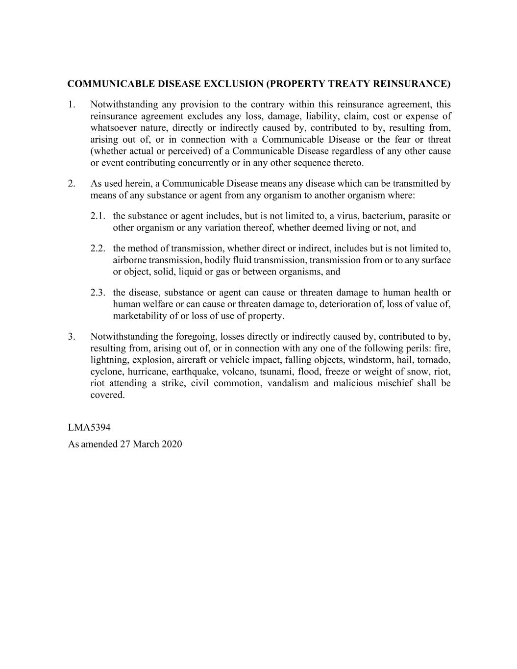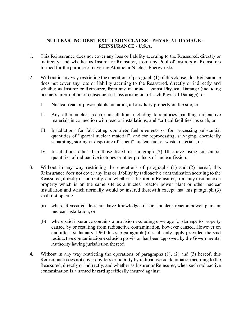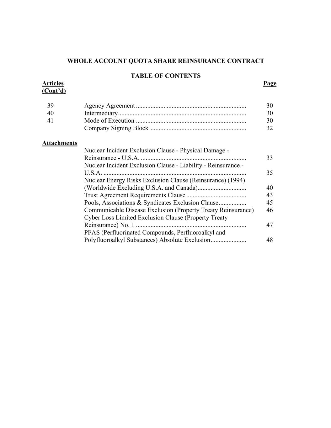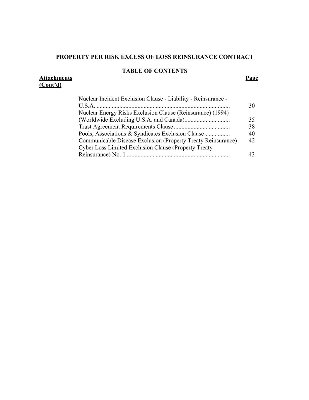 WHOLE ACCOUNT QUOTA SHARE REINSURANCE CONTRACT TABLE OF CONTENTS Attachments Page Nuclear Incident Exclusion Clause - Physical Damage - Reinsurance - U.S.A. ................................................................. 30 Nuclear Incident Exclusion Clause - Liability - Reinsurance - U.S.A. ........................................................................................ 32 Nuclear Energy Risks Exclusion Clause (Reinsurance) (1994) (Worldwide Excluding U.S.A. and Canada) .............................. 37 Trust Agreement Requirements Clause ..................................... 40 Pools, Associations & Syndicates Exclusion Clause ................. 42 Communicable Disease Exclusion (Property Treaty Reinsurance) 43 Cyber Loss Limited Exclusion Clause (Property Treaty Reinsurance) No. 1 .................................................................... 44