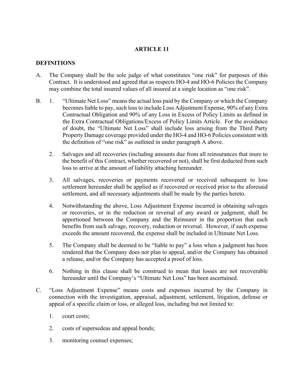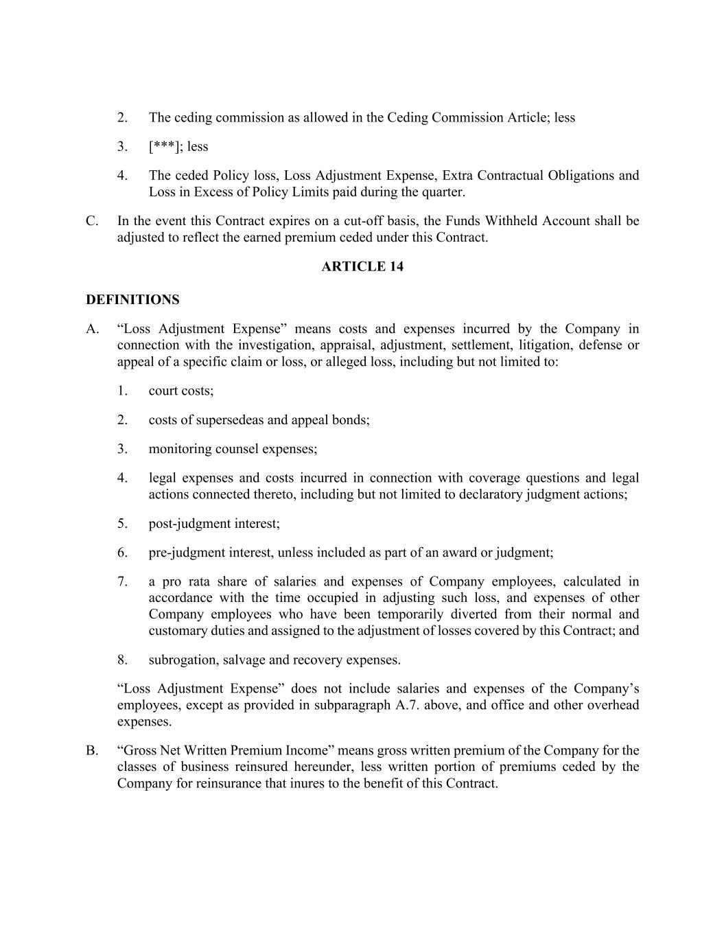 b. the provisional ceding commission as provided for in the Ceding Commission Article; less c. ceded loss and Loss Adjustment Expense paid during the quarter; plus d. ceded subrogation, salvage, or other recoveries during the quarter; and e. the net balance due either party. 2. The net balance shall be paid within 15 days after receipt of the report. 3. In addition, the Company shall furnish the Reinsurer with a quarterly statement showing the unearned premium reserves, and the reserves for outstanding losses including Loss Adjustment Expense. The Company shall also provide the Reinsurer with such other information as may be required by the Reinsurer for completion of its financial statements. B. Should the amount recoverable under this Contract exceed [***] as respects any one risk, Policy loss, or Loss Occurrence, the Company may give the Reinsurer notice of payment made or its intention to make payment on a certain date. If the Company has paid the loss, then payment shall be made by the Reinsurer immediately. If the Company intends to pay the loss by a certain date and has submitted a proof of loss or similar document, then payment shall be due from the Reinsurer 24 hours prior to that date, provided the Reinsurer has a period of 15 days after receipt of said notice to dispatch the payment. Cash loss amounts specifically remitted by the Reinsurer as set forth herein shall be credited to the next quarterly account. ARTICLE 12 DEFINITIONS A. “Loss Adjustment Expense” means costs and expenses incurred by the Company in connection with the investigation, appraisal, adjustment, settlement, litigation, defense or appeal of a specific claim or loss, or alleged loss, including but not limited to: 1. court costs; 2. costs of supersedeas and appeal bonds; 3. monitoring counsel expenses; 4. legal expenses and costs incurred in connection with coverage questions and legal actions connected thereto, including but not limited to declaratory judgment actions; 5. post-judgment interest; 6. pre-judgment interest, unless included as part of an award or judgment;