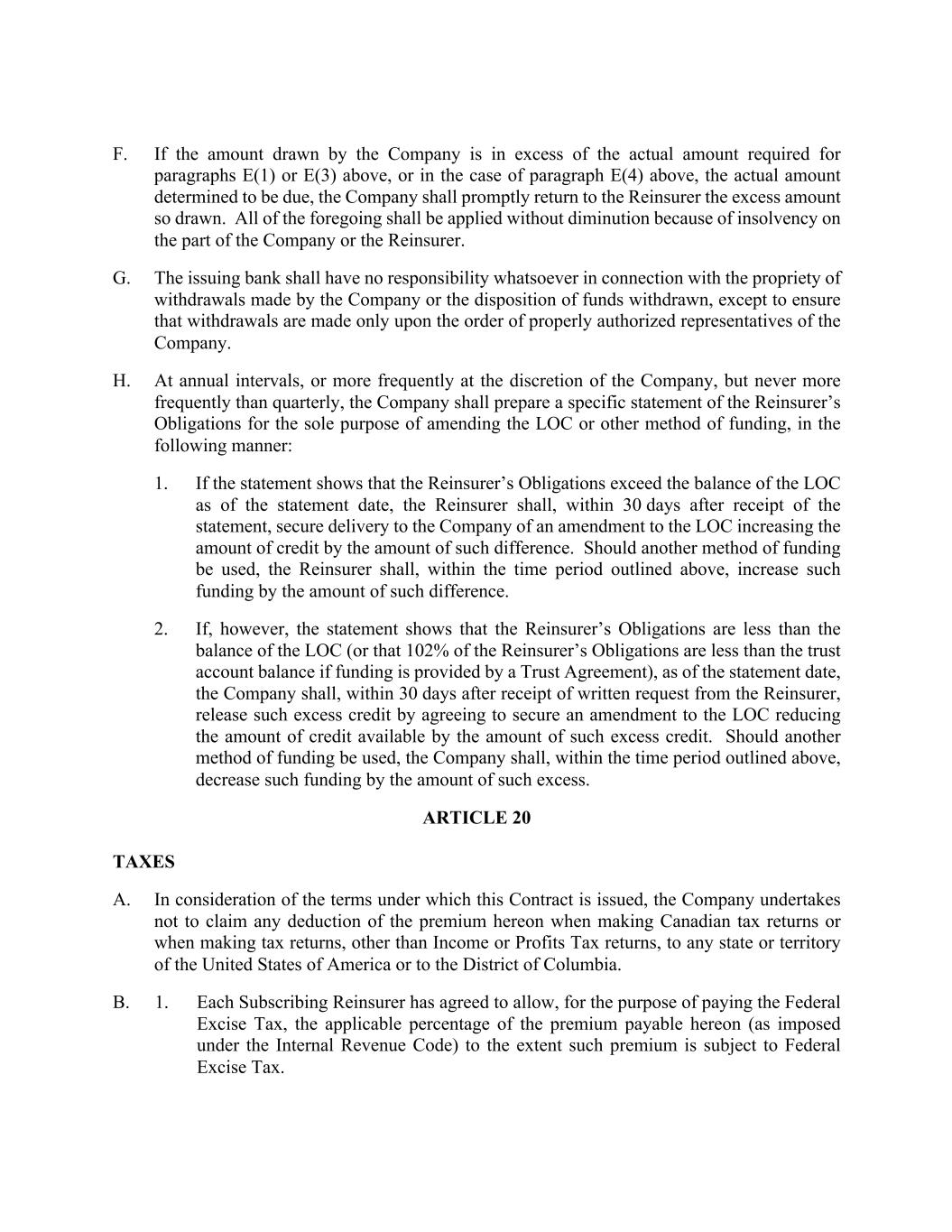 so drawn. All of the foregoing shall be applied without diminution because of insolvency on the part of the Company or the Reinsurer. G. The issuing bank shall have no responsibility whatsoever in connection with the propriety of withdrawals made by the Company or the disposition of funds withdrawn, except to ensure that withdrawals are made only upon the order of properly authorized representatives of the Company. H. At annual intervals, or more frequently at the discretion of the Company, but never more frequently than quarterly, the Company shall prepare a specific statement of the Reinsurer’s Obligations for the sole purpose of amending the LOC or other method of funding, in the following manner: 1. If the statement shows that the Reinsurer’s Obligations exceed the balance of the LOC as of the statement date, the Reinsurer shall, within 30 days after receipt of the statement, secure delivery to the Company of an amendment to the LOC increasing the amount of credit by the amount of such difference. Should another method of funding be used, the Reinsurer shall, within the time period outlined above, increase such funding by the amount of such difference. 2. If, however, the statement shows that the Reinsurer’s Obligations are less than the balance of the LOC (or that 102% of the Reinsurer’s Obligations are less than the trust account balance if funding is provided by a Trust Agreement), as of the statement date, the Company shall, within 30 days after receipt of written request from the Reinsurer, release such excess credit by agreeing to secure an amendment to the LOC reducing the amount of credit available by the amount of such excess credit. Should another method of funding be used, the Company shall, within the time period outlined above, decrease such funding by the amount of such excess. ARTICLE 22 TAXES A. In consideration of the terms under which this Contract is issued, the Company undertakes not to claim any deduction of the premium hereon when making Canadian tax returns or when making tax returns, other than Income or Profits Tax returns, to any state or territory of the United States of America or to the District of Columbia. B. 1. Each Subscribing Reinsurer has agreed to allow, for the purpose of paying the Federal Excise Tax, the applicable percentage of the premium payable hereon (as imposed under the Internal Revenue Code) to the extent such premium is subject to Federal Excise Tax. 2. In the event of any return of premium becoming due hereunder, the Subscribing Reinsurer shall deduct the applicable percentage of the premium from the amount of