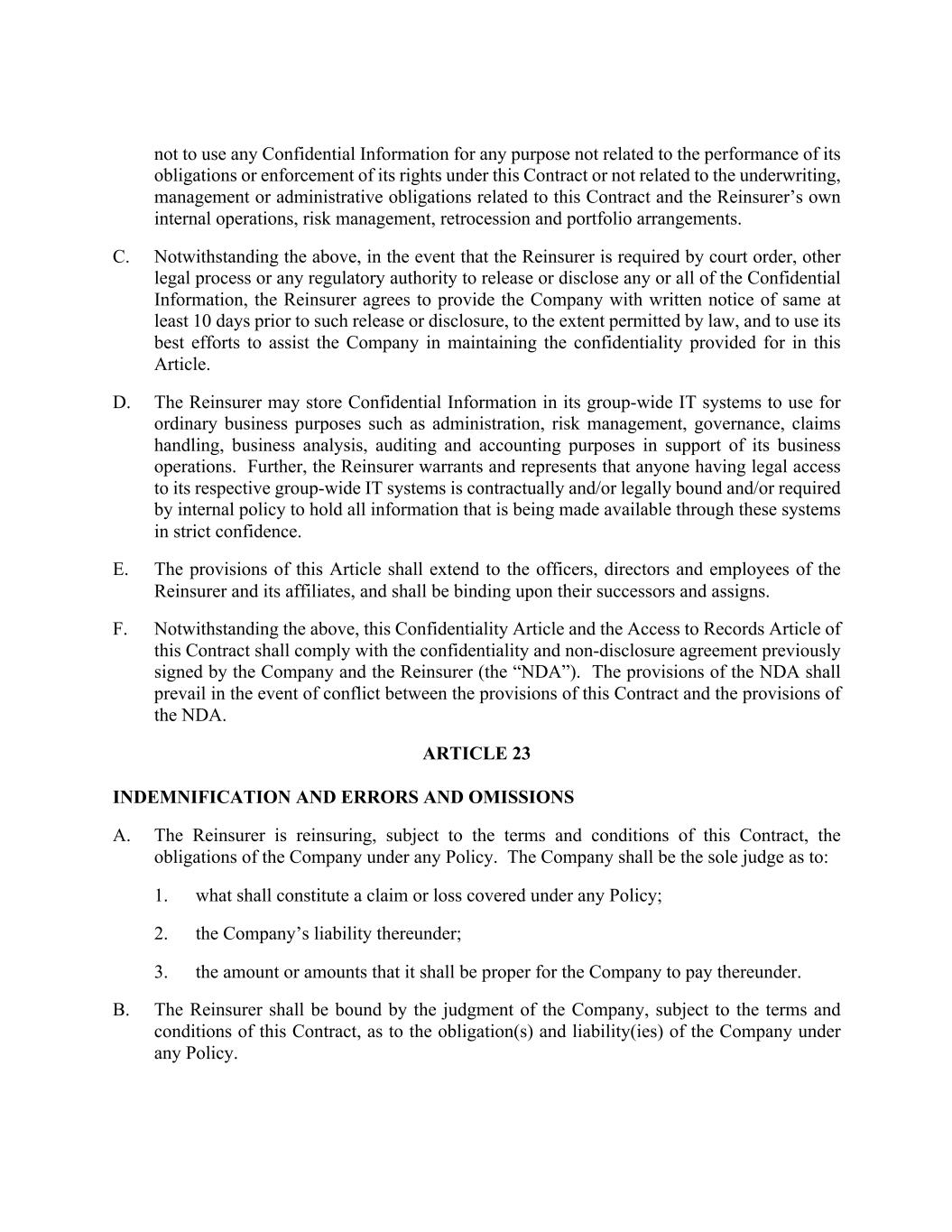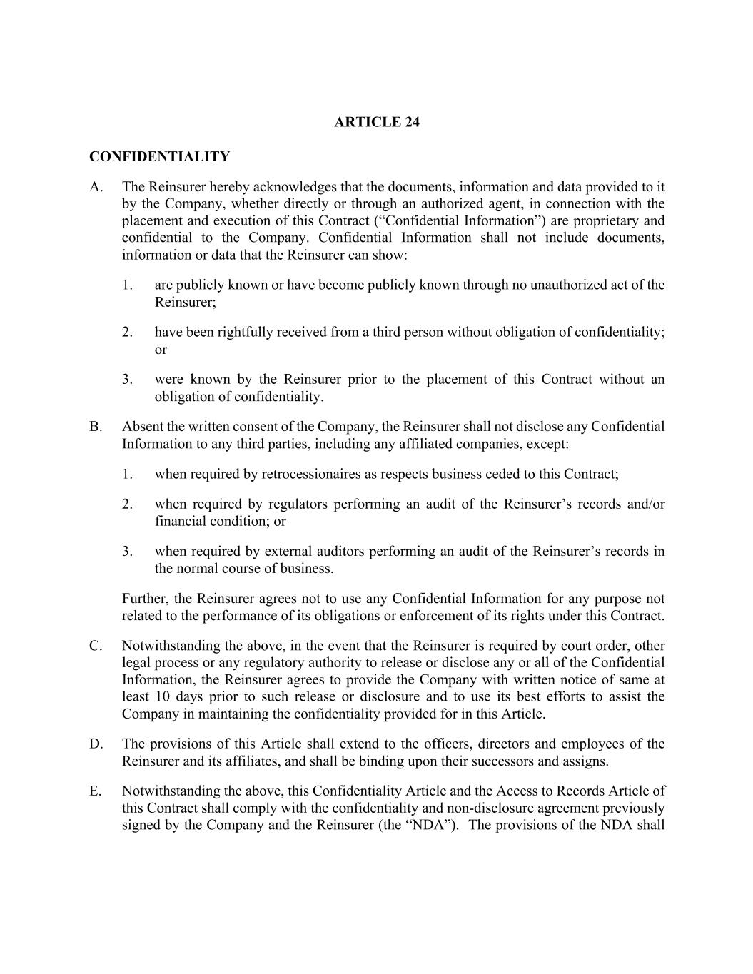 ARTICLE 24 CONFIDENTIALITY A. The Reinsurer hereby acknowledges that the documents, information and data provided to it by the Company, whether directly or through an authorized agent, in connection with the placement and execution of this Contract (“Confidential Information”) are proprietary and confidential to the Company. Confidential Information shall not include documents, information or data that the Reinsurer can show: 1. are publicly known or have become publicly known through no unauthorized act of the Reinsurer; 2. have been rightfully received from a third person without obligation of confidentiality; or 3. were known by the Reinsurer prior to the placement of this Contract without an obligation of confidentiality. B. Absent the written consent of the Company, the Reinsurer shall not disclose any Confidential Information to any third parties, including any affiliated companies, except: 1. when required by retrocessionaires as respects business ceded to this Contract; 2. when required by regulators performing an audit of the Reinsurer’s records and/or financial condition; or 3. when required by external auditors performing an audit of the Reinsurer’s records in the normal course of business. Further, the Reinsurer agrees not to use any Confidential Information for any purpose not related to the performance of its obligations or enforcement of its rights under this Contract. C. Notwithstanding the above, in the event that the Reinsurer is required by court order, other legal process or any regulatory authority to release or disclose any or all of the Confidential Information, the Reinsurer agrees to provide the Company with written notice of same at least 10 days prior to such release or disclosure and to use its best efforts to assist the Company in maintaining the confidentiality provided for in this Article. D. The provisions of this Article shall extend to the officers, directors and employees of the Reinsurer and its affiliates, and shall be binding upon their successors and assigns. E. Notwithstanding the above, this Confidentiality Article and the Access to Records Article of this Contract shall comply with the confidentiality and non-disclosure agreement previously signed by the Company and the Reinsurer (the “NDA”). The provisions of the NDA shall