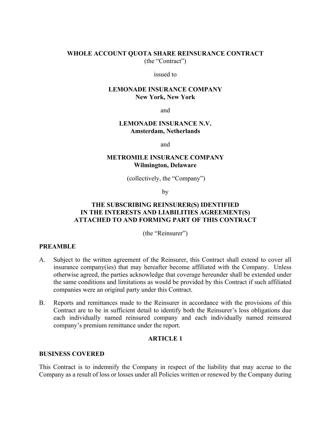 WHOLE ACCOUNT QUOTA SHARE REINSURANCE CONTRACT (the “Contract”) issued to LEMONADE INSURANCE COMPANY New York, New York and LEMONADE INSURANCE N.V. Amsterdam, Netherlands and METROMILE INSURANCE COMPANY Wilmington, Delaware (collectively, the “Company”) by THE SUBSCRIBING REINSURER(S) IDENTIFIED IN THE INTERESTS AND LIABILITIES AGREEMENT(S) ATTACHED TO AND FORMING PART OF THIS CONTRACT (the “Reinsurer”) PREAMBLE A. Wherever the word “Company” is used in this Contract, such term shall be held to include all insurance companies that may hereafter become affiliated with the Company to the extent and under the same conditions and limitations as would be provided by this Contract if such affiliated companies were made a party under this Contract, provided that notice be given to the Reinsurer of any such companies that may hereafter become affiliated with the Company as soon as practicable, with full particulars as to how such affiliation is likely to affect this Contract. In the event of either party maintaining that such affiliation calls for alteration in existing terms, and an agreement not being arrived at, then the business of such affiliated company is covered only for a period of 45 days after notice by either party that they do not wish the company so affiliated to be covered. B. Reports and remittances made to the Reinsurer in accordance with the provisions of this Contract are to be in sufficient detail to identify both the Reinsurer’s loss obligations due each individually named reinsured company and each individually named reinsured company’s premium remittance under the report.