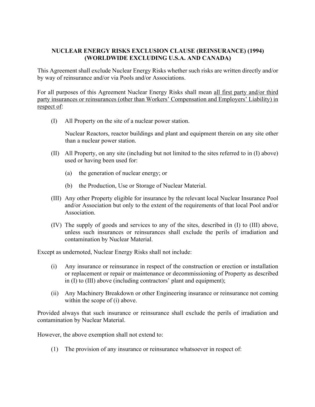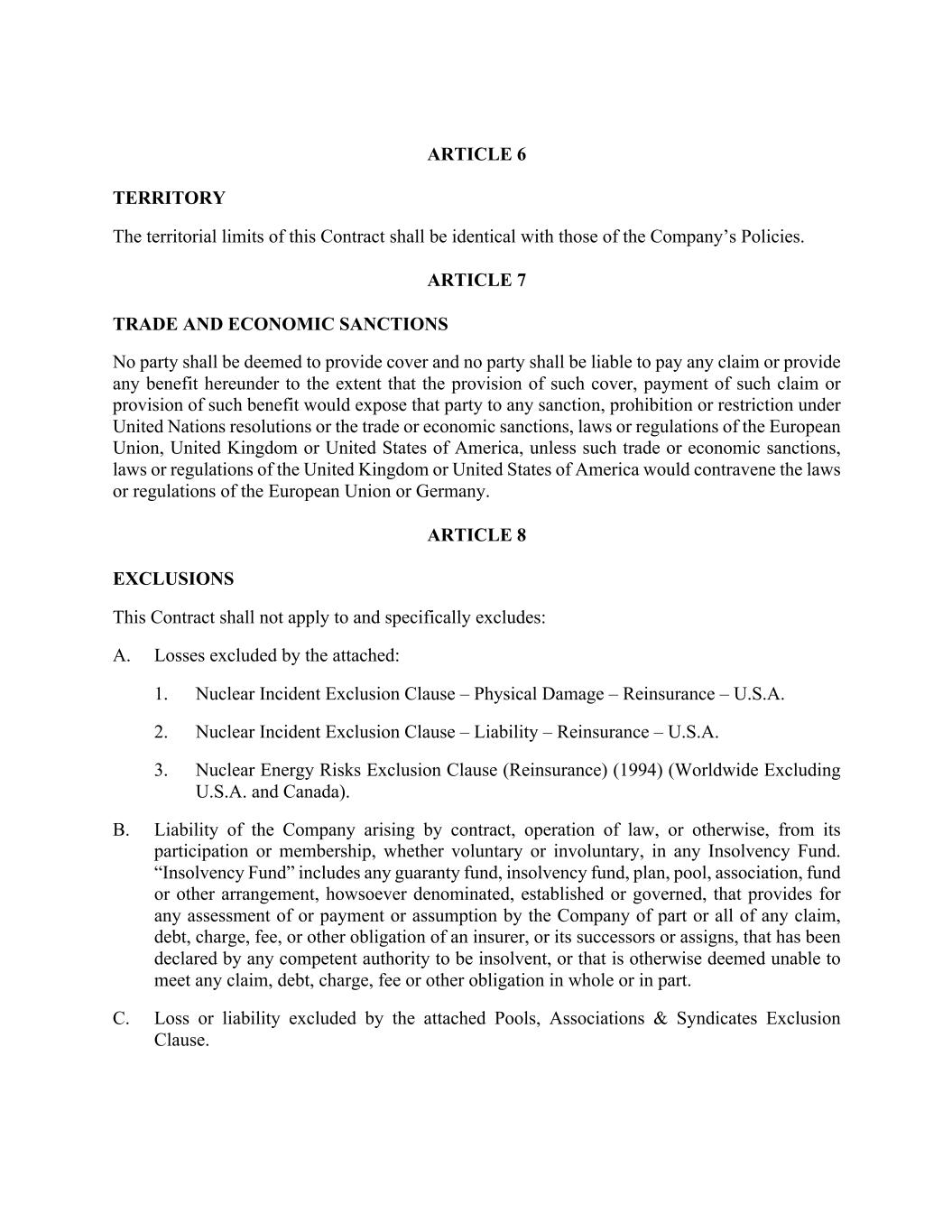 ARTICLE 7 EXCLUSIONS This Contract shall not apply to and specifically excludes: A. Losses excluded by the attached: 1. Nuclear Incident Exclusion Clause – Physical Damage – Reinsurance – U.S.A. 2. Nuclear Incident Exclusion Clause – Liability – Reinsurance – U.S.A. 3. Nuclear Energy Risks Exclusion Clause (Reinsurance) (1994) (Worldwide Excluding U.S.A. and Canada). B. Liability of the Company arising by contract, operation of law, or otherwise, from its participation or membership, whether voluntary or involuntary, in any Insolvency Fund. “Insolvency Fund” includes any guaranty fund, insolvency fund, plan, pool, association, fund or other arrangement, howsoever denominated, established or governed, that provides for any assessment of or payment or assumption by the Company of part or all of any claim, debt, charge, fee, or other obligation of an insurer, or its successors or assigns, that has been declared by any competent authority to be insolvent, or that is otherwise deemed unable to meet any claim, debt, charge, fee or other obligation in whole or in part. C. Loss or liability excluded by the attached Pools, Associations & Syndicates Exclusion Clause. D. Any loss resulting from an “Act of Terrorism,” as defined herein, when the loss directly or indirectly involves a release of biological, chemical, radiological or nuclear materials. “Act of Terrorism” shall mean: (i) the intentional use, release or escape of nuclear materials that directly results in nuclear reaction or nuclear radiation or radioactive contamination at a level sufficient to cause harm to property; or (ii) the intentional dispersal or application of pathogenic biological materials or poisonous chemical materials in a quantity sufficient to cause harm to property; or (iii) the release of pathogenic biological materials or poisonous chemical materials in a quantity sufficient to cause harm to property, where one purpose of the Act of Terrorism was the intentional release of such materials. This exclusion shall not be construed to apply to loss occasioned by riots, strikes, civil commotion, vandalism or malicious damage as those terms have been interpreted by United States Courts to apply to insurance policies, nor to fire following an Act of Terrorism when the Company is prohibited from excluding such risk from its Policies.