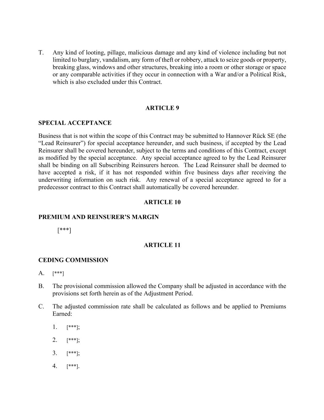 3. individual that is resident in or located in an Excluded Territory; 4. claim, action, suit or enforcement proceeding brought or maintained in an Excluded Territory; or 5. payment in an Excluded Territory. This exclusion will not apply to any coverage or benefit required to be provided by the insurer by law or regulation applicable to that insurer, however, the terms of any sanctions clause will prevail. For purposes of this exclusion, “Excluded Territory” means - Belarus (Republic of Belarus); and - Russian Federation; and - Ukraine (including the Crimean Peninsula and the Donetsk and Luhansk regions). T. Loss or liability excluded by the attached Communicable Disease Exclusion (Property Treaty Reinsurance). U. Loss or liability excluded by the attached Cyber Loss Limited Exclusion Clause (Property Treaty Reinsurance) No. 1. ARTICLE 8 SPECIAL ACCEPTANCE Business that is not within the scope of this Contract may be submitted to the Reinsurer for special acceptance hereunder, and such business, if accepted by the Reinsurer shall be covered hereunder, subject to the terms and conditions of this Contract, except as modified by the special acceptance. The Reinsurer shall be deemed to have accepted a risk, if it has not responded within three days after receiving the underwriting information on such risk. Any renewal of a special acceptance agreed to for a predecessor contract to this Contract shall automatically be covered hereunder. ARTICLE 9 PREMIUM A. [***] B. [***]