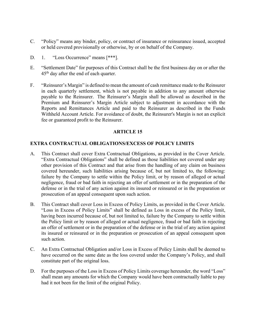 C. “Policy” means any binder, policy, or contract of insurance or reinsurance issued, accepted or held covered provisionally or otherwise, by or on behalf of the Company. D. 1. “Loss Occurrence” means [***]. E. “Settlement Date” for purposes of this Contract shall be the first business day on or after the 45th day after the end of each quarter. F. “Reinsurer’s Margin” is defined to mean the amount of cash remittance made to the Reinsurer in each quarterly settlement, which is not payable in addition to any amount otherwise payable to the Reinsurer. The Reinsurer’s Margin shall be allowed as described in the Premium and Reinsurer’s Margin Article subject to adjustment in accordance with the Reports and Remittances Article and paid to the Reinsurer as described in the Funds Withheld Account Article. For avoidance of doubt, the Reinsurer's Margin is not an explicit fee or guaranteed profit to the Reinsurer. ARTICLE 15 EXTRA CONTRACTUAL OBLIGATIONS/EXCESS OF POLICY LIMITS A. This Contract shall cover Extra Contractual Obligations, as provided in the Cover Article. “Extra Contractual Obligations” shall be defined as those liabilities not covered under any other provision of this Contract and that arise from the handling of any claim on business covered hereunder, such liabilities arising because of, but not limited to, the following: failure by the Company to settle within the Policy limit, or by reason of alleged or actual negligence, fraud or bad faith in rejecting an offer of settlement or in the preparation of the defense or in the trial of any action against its insured or reinsured or in the preparation or prosecution of an appeal consequent upon such action. B. This Contract shall cover Loss in Excess of Policy Limits, as provided in the Cover Article. “Loss in Excess of Policy Limits” shall be defined as Loss in excess of the Policy limit, having been incurred because of, but not limited to, failure by the Company to settle within the Policy limit or by reason of alleged or actual negligence, fraud or bad faith in rejecting an offer of settlement or in the preparation of the defense or in the trial of any action against its insured or reinsured or in the preparation or prosecution of an appeal consequent upon such action. C. An Extra Contractual Obligation and/or Loss in Excess of Policy Limits shall be deemed to have occurred on the same date as the loss covered under the Company’s Policy, and shall constitute part of the original loss. D. For the purposes of the Loss in Excess of Policy Limits coverage hereunder, the word “Loss” shall mean any amounts for which the Company would have been contractually liable to pay had it not been for the limit of the original Policy.