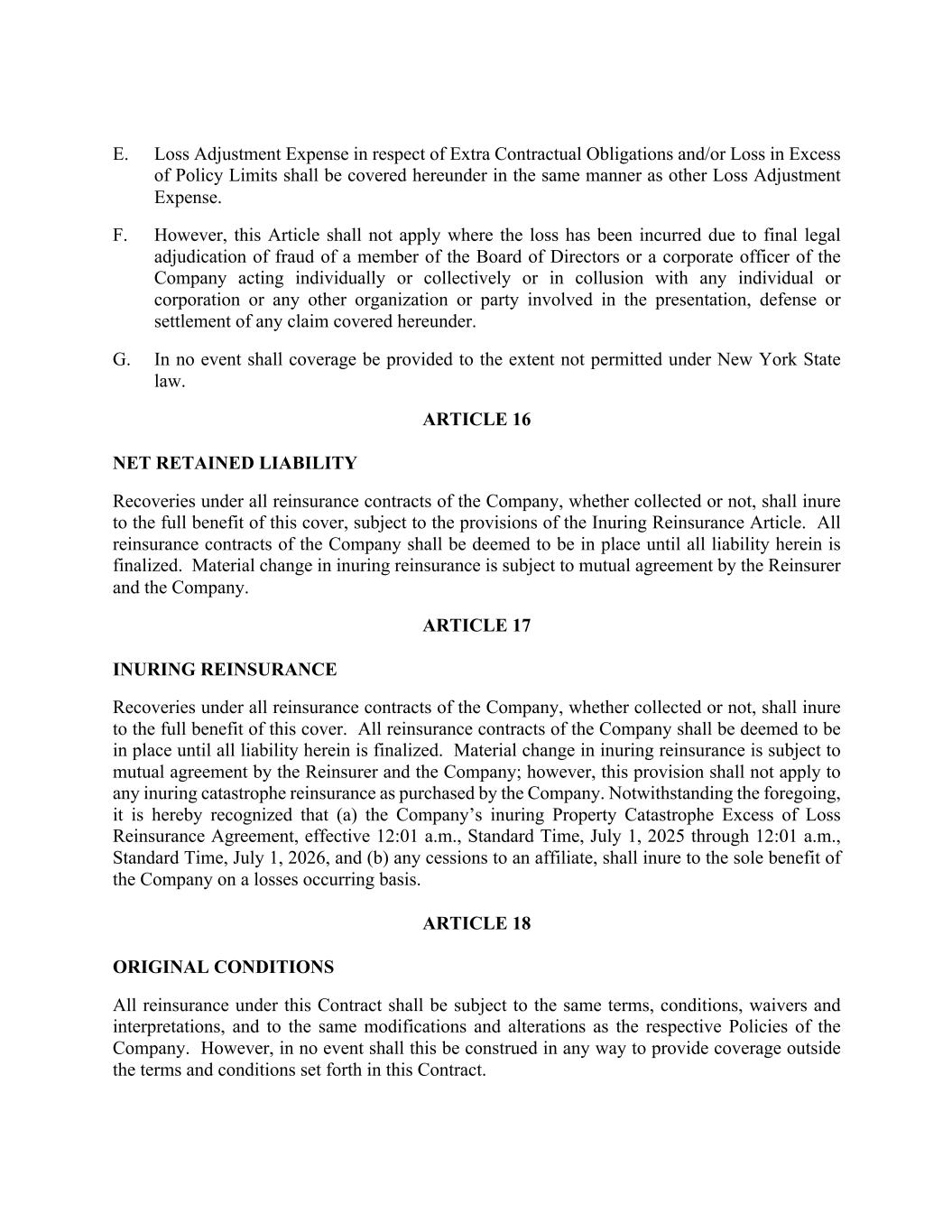 E. Loss Adjustment Expense in respect of Extra Contractual Obligations and/or Loss in Excess of Policy Limits shall be covered hereunder in the same manner as other Loss Adjustment Expense. F. However, this Article shall not apply where the loss has been incurred due to final legal adjudication of fraud of a member of the Board of Directors or a corporate officer of the Company acting individually or collectively or in collusion with any individual or corporation or any other organization or party involved in the presentation, defense or settlement of any claim covered hereunder. G. In no event shall coverage be provided to the extent not permitted under New York State law. ARTICLE 16 NET RETAINED LIABILITY Recoveries under all reinsurance contracts of the Company, whether collected or not, shall inure to the full benefit of this cover, subject to the provisions of the Inuring Reinsurance Article. All reinsurance contracts of the Company shall be deemed to be in place until all liability herein is finalized. Material change in inuring reinsurance is subject to mutual agreement by the Reinsurer and the Company. ARTICLE 17 INURING REINSURANCE Recoveries under all reinsurance contracts of the Company, whether collected or not, shall inure to the full benefit of this cover. All reinsurance contracts of the Company shall be deemed to be in place until all liability herein is finalized. Material change in inuring reinsurance is subject to mutual agreement by the Reinsurer and the Company; however, this provision shall not apply to any inuring catastrophe reinsurance as purchased by the Company. Notwithstanding the foregoing, it is hereby recognized that (a) the Company’s inuring Property Catastrophe Excess of Loss Reinsurance Agreement, effective 12:01 a.m., Standard Time, July 1, 2025 through 12:01 a.m., Standard Time, July 1, 2026, and (b) any cessions to an affiliate, shall inure to the sole benefit of the Company on a losses occurring basis. ARTICLE 18 ORIGINAL CONDITIONS All reinsurance under this Contract shall be subject to the same terms, conditions, waivers and interpretations, and to the same modifications and alterations as the respective Policies of the Company. However, in no event shall this be construed in any way to provide coverage outside the terms and conditions set forth in this Contract.