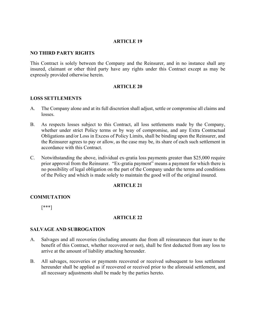 ARTICLE 19 NO THIRD PARTY RIGHTS This Contract is solely between the Company and the Reinsurer, and in no instance shall any insured, claimant or other third party have any rights under this Contract except as may be expressly provided otherwise herein. ARTICLE 20 LOSS SETTLEMENTS A. The Company alone and at its full discretion shall adjust, settle or compromise all claims and losses. B. As respects losses subject to this Contract, all loss settlements made by the Company, whether under strict Policy terms or by way of compromise, and any Extra Contractual Obligations and/or Loss in Excess of Policy Limits, shall be binding upon the Reinsurer, and the Reinsurer agrees to pay or allow, as the case may be, its share of each such settlement in accordance with this Contract. C. Notwithstanding the above, individual ex-gratia loss payments greater than $25,000 require prior approval from the Reinsurer. “Ex-gratia payment” means a payment for which there is no possibility of legal obligation on the part of the Company under the terms and conditions of the Policy and which is made solely to maintain the good will of the original insured. ARTICLE 21 COMMUTATION [***] ARTICLE 22 SALVAGE AND SUBROGATION A. Salvages and all recoveries (including amounts due from all reinsurances that inure to the benefit of this Contract, whether recovered or not), shall be first deducted from any loss to arrive at the amount of liability attaching hereunder. B. All salvages, recoveries or payments recovered or received subsequent to loss settlement hereunder shall be applied as if recovered or received prior to the aforesaid settlement, and all necessary adjustments shall be made by the parties hereto.