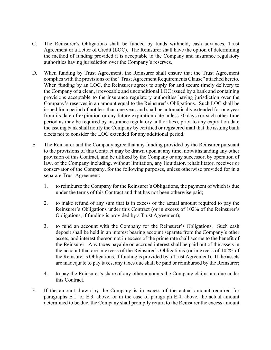 C. The Reinsurer’s Obligations shall be funded by funds withheld, cash advances, Trust Agreement or a Letter of Credit (LOC). The Reinsurer shall have the option of determining the method of funding provided it is acceptable to the Company and insurance regulatory authorities having jurisdiction over the Company’s reserves. D. When funding by Trust Agreement, the Reinsurer shall ensure that the Trust Agreement complies with the provisions of the “Trust Agreement Requirements Clause” attached hereto. When funding by an LOC, the Reinsurer agrees to apply for and secure timely delivery to the Company of a clean, irrevocable and unconditional LOC issued by a bank and containing provisions acceptable to the insurance regulatory authorities having jurisdiction over the Company’s reserves in an amount equal to the Reinsurer’s Obligations. Such LOC shall be issued for a period of not less than one year, and shall be automatically extended for one year from its date of expiration or any future expiration date unless 30 days (or such other time period as may be required by insurance regulatory authorities), prior to any expiration date the issuing bank shall notify the Company by certified or registered mail that the issuing bank elects not to consider the LOC extended for any additional period. E. The Reinsurer and the Company agree that any funding provided by the Reinsurer pursuant to the provisions of this Contract may be drawn upon at any time, notwithstanding any other provision of this Contract, and be utilized by the Company or any successor, by operation of law, of the Company including, without limitation, any liquidator, rehabilitator, receiver or conservator of the Company, for the following purposes, unless otherwise provided for in a separate Trust Agreement: 1. to reimburse the Company for the Reinsurer’s Obligations, the payment of which is due under the terms of this Contract and that has not been otherwise paid; 2. to make refund of any sum that is in excess of the actual amount required to pay the Reinsurer’s Obligations under this Contract (or in excess of 102% of the Reinsurer’s Obligations, if funding is provided by a Trust Agreement); 3. to fund an account with the Company for the Reinsurer’s Obligations. Such cash deposit shall be held in an interest bearing account separate from the Company’s other assets, and interest thereon not in excess of the prime rate shall accrue to the benefit of the Reinsurer. Any taxes payable on accrued interest shall be paid out of the assets in the account that are in excess of the Reinsurer’s Obligations (or in excess of 102% of the Reinsurer’s Obligations, if funding is provided by a Trust Agreement). If the assets are inadequate to pay taxes, any taxes due shall be paid or reimbursed by the Reinsurer; 4. to pay the Reinsurer’s share of any other amounts the Company claims are due under this Contract. F. If the amount drawn by the Company is in excess of the actual amount required for paragraphs E.1. or E.3. above, or in the case of paragraph E.4. above, the actual amount determined to be due, the Company shall promptly return to the Reinsurer the excess amount