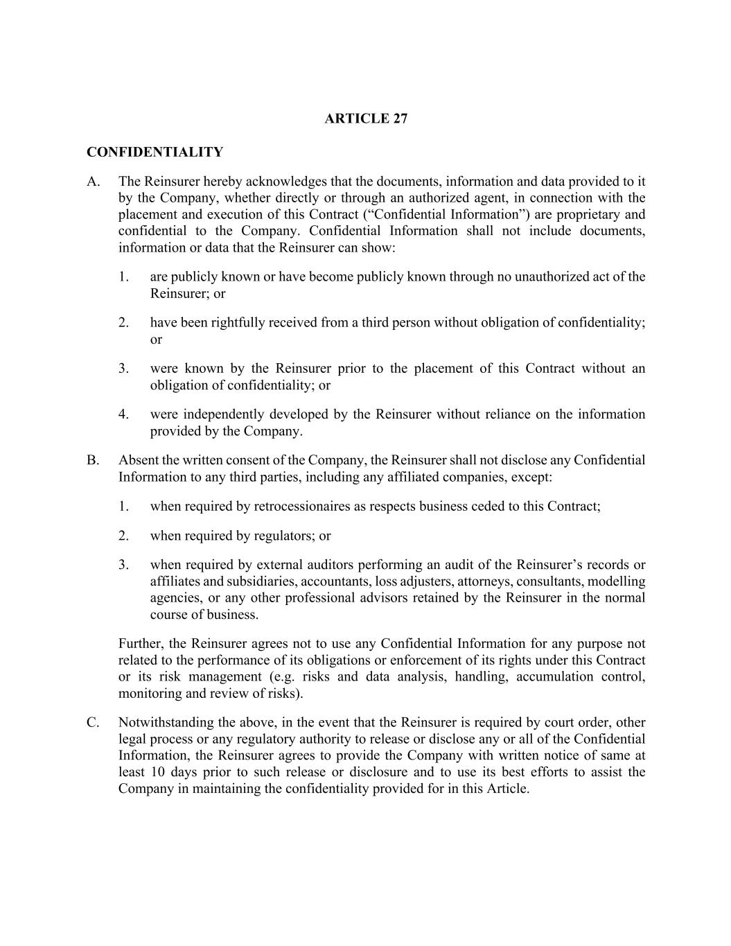 ARTICLE 27 CONFIDENTIALITY A. The Reinsurer hereby acknowledges that the documents, information and data provided to it by the Company, whether directly or through an authorized agent, in connection with the placement and execution of this Contract (“Confidential Information”) are proprietary and confidential to the Company. Confidential Information shall not include documents, information or data that the Reinsurer can show: 1. are publicly known or have become publicly known through no unauthorized act of the Reinsurer; or 2. have been rightfully received from a third person without obligation of confidentiality; or 3. were known by the Reinsurer prior to the placement of this Contract without an obligation of confidentiality; or 4. were independently developed by the Reinsurer without reliance on the information provided by the Company. B. Absent the written consent of the Company, the Reinsurer shall not disclose any Confidential Information to any third parties, including any affiliated companies, except: 1. when required by retrocessionaires as respects business ceded to this Contract; 2. when required by regulators; or 3. when required by external auditors performing an audit of the Reinsurer’s records or affiliates and subsidiaries, accountants, loss adjusters, attorneys, consultants, modelling agencies, or any other professional advisors retained by the Reinsurer in the normal course of business. Further, the Reinsurer agrees not to use any Confidential Information for any purpose not related to the performance of its obligations or enforcement of its rights under this Contract or its risk management (e.g. risks and data analysis, handling, accumulation control, monitoring and review of risks). C. Notwithstanding the above, in the event that the Reinsurer is required by court order, other legal process or any regulatory authority to release or disclose any or all of the Confidential Information, the Reinsurer agrees to provide the Company with written notice of same at least 10 days prior to such release or disclosure and to use its best efforts to assist the Company in maintaining the confidentiality provided for in this Article.