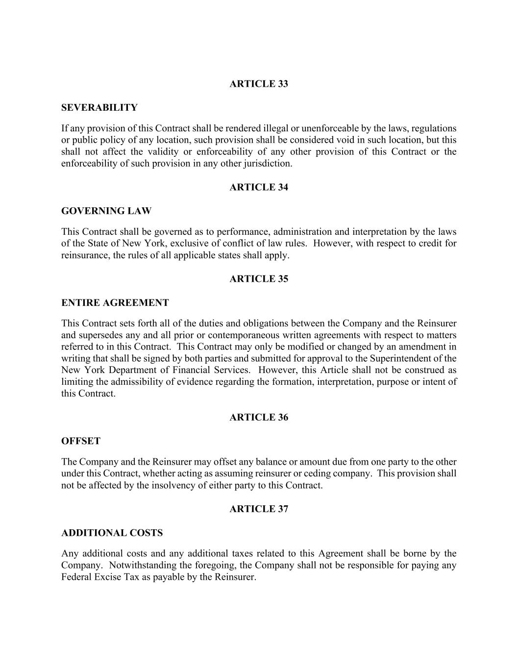 ARTICLE 33 SEVERABILITY If any provision of this Contract shall be rendered illegal or unenforceable by the laws, regulations or public policy of any location, such provision shall be considered void in such location, but this shall not affect the validity or enforceability of any other provision of this Contract or the enforceability of such provision in any other jurisdiction. ARTICLE 34 GOVERNING LAW This Contract shall be governed as to performance, administration and interpretation by the laws of the State of New York, exclusive of conflict of law rules. However, with respect to credit for reinsurance, the rules of all applicable states shall apply. ARTICLE 35 ENTIRE AGREEMENT This Contract sets forth all of the duties and obligations between the Company and the Reinsurer and supersedes any and all prior or contemporaneous written agreements with respect to matters referred to in this Contract. This Contract may only be modified or changed by an amendment in writing that shall be signed by both parties and submitted for approval to the Superintendent of the New York Department of Financial Services. However, this Article shall not be construed as limiting the admissibility of evidence regarding the formation, interpretation, purpose or intent of this Contract. ARTICLE 36 OFFSET The Company and the Reinsurer may offset any balance or amount due from one party to the other under this Contract, whether acting as assuming reinsurer or ceding company. This provision shall not be affected by the insolvency of either party to this Contract. ARTICLE 37 ADDITIONAL COSTS Any additional costs and any additional taxes related to this Agreement shall be borne by the Company. Notwithstanding the foregoing, the Company shall not be responsible for paying any Federal Excise Tax as payable by the Reinsurer.