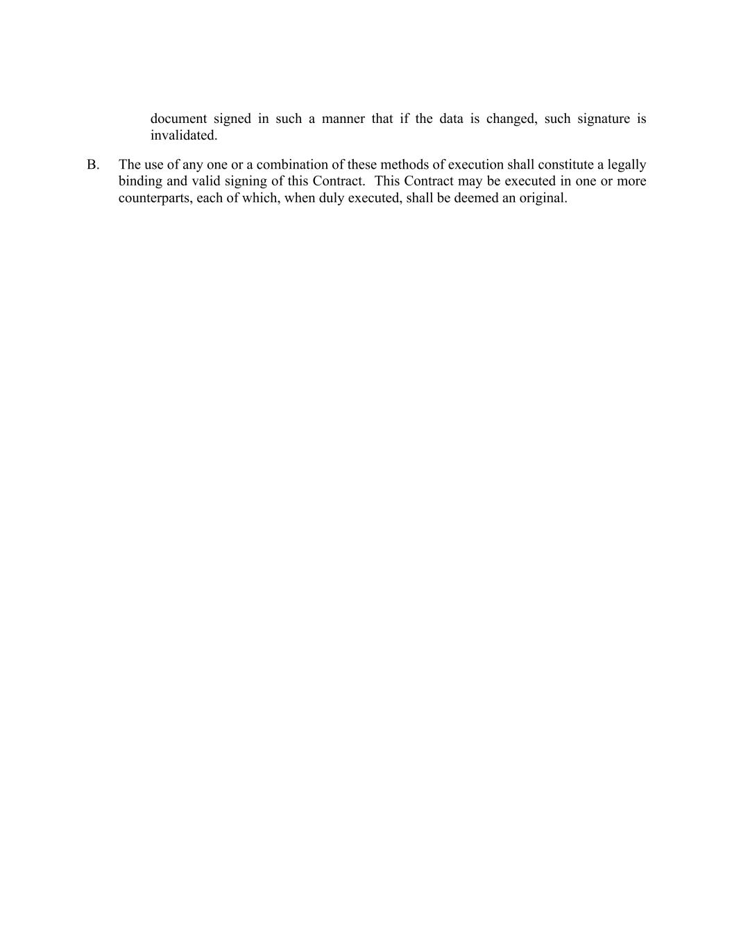 document signed in such a manner that if the data is changed, such signature is invalidated. B. The use of any one or a combination of these methods of execution shall constitute a legally binding and valid signing of this Contract. This Contract may be executed in one or more counterparts, each of which, when duly executed, shall be deemed an original.