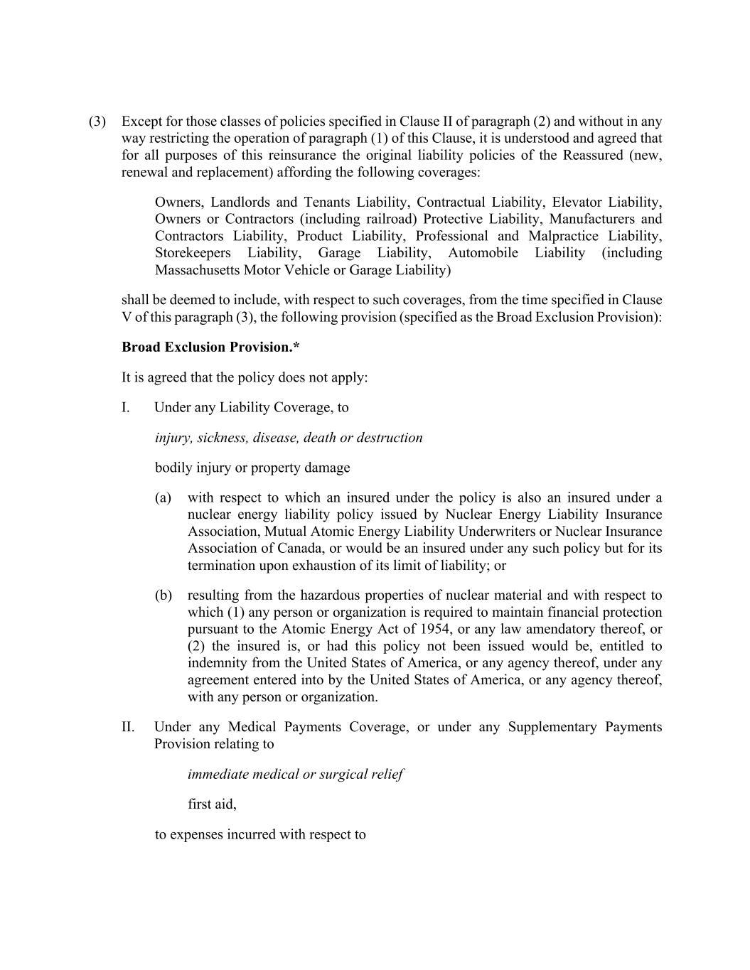 (3) Except for those classes of policies specified in Clause II of paragraph (2) and without in any way restricting the operation of paragraph (1) of this Clause, it is understood and agreed that for all purposes of this reinsurance the original liability policies of the Reassured (new, renewal and replacement) affording the following coverages: Owners, Landlords and Tenants Liability, Contractual Liability, Elevator Liability, Owners or Contractors (including railroad) Protective Liability, Manufacturers and Contractors Liability, Product Liability, Professional and Malpractice Liability, Storekeepers Liability, Garage Liability, Automobile Liability (including Massachusetts Motor Vehicle or Garage Liability) shall be deemed to include, with respect to such coverages, from the time specified in Clause V of this paragraph (3), the following provision (specified as the Broad Exclusion Provision): Broad Exclusion Provision.* It is agreed that the policy does not apply: I. Under any Liability Coverage, to injury, sickness, disease, death or destruction bodily injury or property damage (a) with respect to which an insured under the policy is also an insured under a nuclear energy liability policy issued by Nuclear Energy Liability Insurance Association, Mutual Atomic Energy Liability Underwriters or Nuclear Insurance Association of Canada, or would be an insured under any such policy but for its termination upon exhaustion of its limit of liability; or (b) resulting from the hazardous properties of nuclear material and with respect to which (1) any person or organization is required to maintain financial protection pursuant to the Atomic Energy Act of 1954, or any law amendatory thereof, or (2) the insured is, or had this policy not been issued would be, entitled to indemnity from the United States of America, or any agency thereof, under any agreement entered into by the United States of America, or any agency thereof, with any person or organization. II. Under any Medical Payments Coverage, or under any Supplementary Payments Provision relating to immediate medical or surgical relief first aid, to expenses incurred with respect to