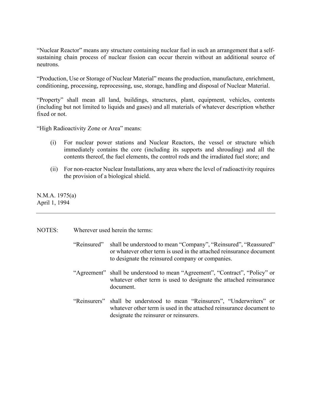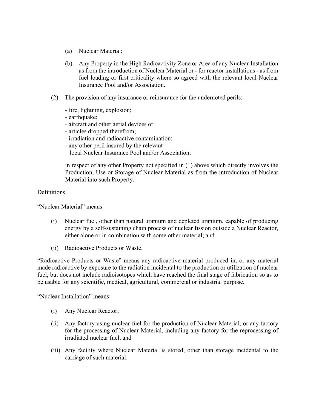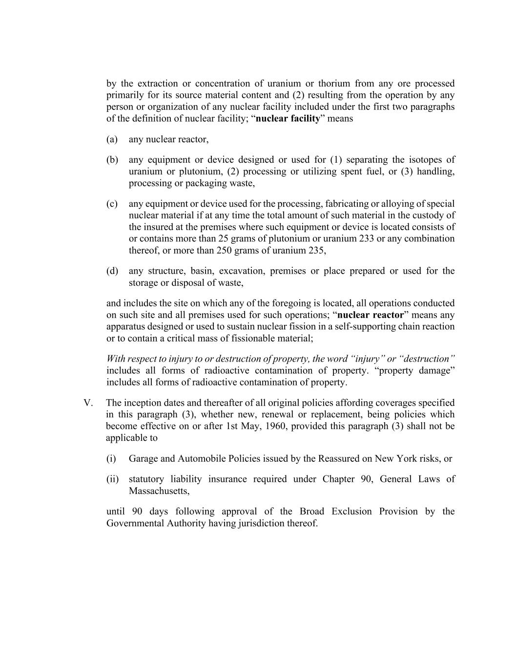 by the extraction or concentration of uranium or thorium from any ore processed primarily for its source material content and (2) resulting from the operation by any person or organization of any nuclear facility included under the first two paragraphs of the definition of nuclear facility; “nuclear facility” means (a) any nuclear reactor, (b) any equipment or device designed or used for (1) separating the isotopes of uranium or plutonium, (2) processing or utilizing spent fuel, or (3) handling, processing or packaging waste, (c) any equipment or device used for the processing, fabricating or alloying of special nuclear material if at any time the total amount of such material in the custody of the insured at the premises where such equipment or device is located consists of or contains more than 25 grams of plutonium or uranium 233 or any combination thereof, or more than 250 grams of uranium 235, (d) any structure, basin, excavation, premises or place prepared or used for the storage or disposal of waste, and includes the site on which any of the foregoing is located, all operations conducted on such site and all premises used for such operations; “nuclear reactor” means any apparatus designed or used to sustain nuclear fission in a self-supporting chain reaction or to contain a critical mass of fissionable material; With respect to injury to or destruction of property, the word “injury” or “destruction” includes all forms of radioactive contamination of property. “property damage” includes all forms of radioactive contamination of property. V. The inception dates and thereafter of all original policies affording coverages specified in this paragraph (3), whether new, renewal or replacement, being policies which become effective on or after 1st May, 1960, provided this paragraph (3) shall not be applicable to (i) Garage and Automobile Policies issued by the Reassured on New York risks, or (ii) statutory liability insurance required under Chapter 90, General Laws of Massachusetts, until 90 days following approval of the Broad Exclusion Provision by the Governmental Authority having jurisdiction thereof.
