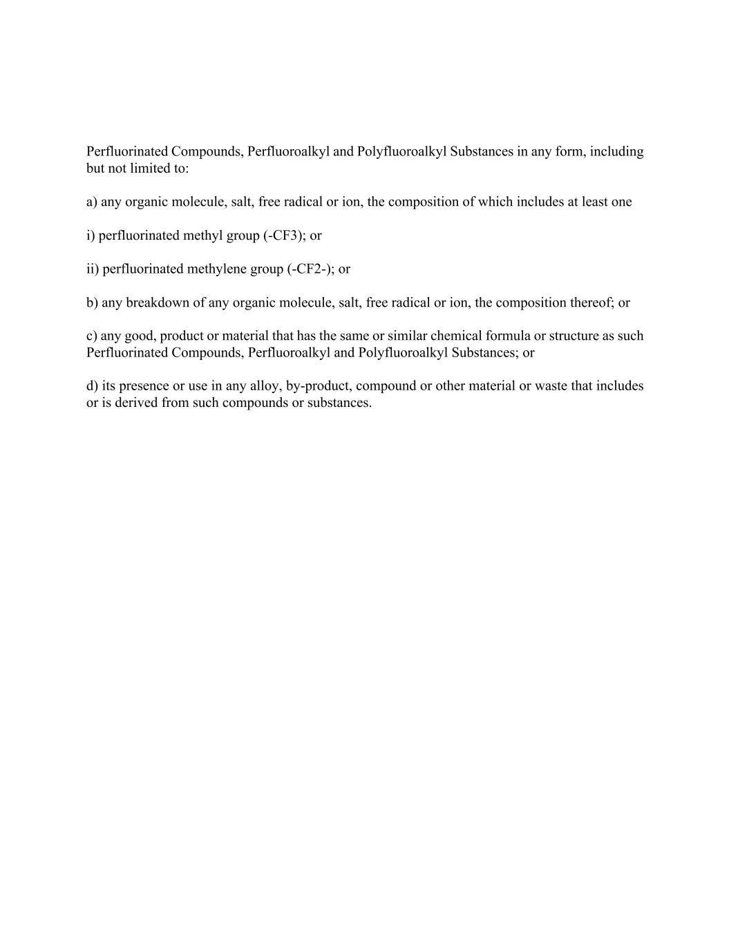 Perfluorinated Compounds, Perfluoroalkyl and Polyfluoroalkyl Substances in any form, including but not limited to: a) any organic molecule, salt, free radical or ion, the composition of which includes at least one i) perfluorinated methyl group (-CF3); or ii) perfluorinated methylene group (-CF2-); or b) any breakdown of any organic molecule, salt, free radical or ion, the composition thereof; or c) any good, product or material that has the same or similar chemical formula or structure as such Perfluorinated Compounds, Perfluoroalkyl and Polyfluoroalkyl Substances; or d) its presence or use in any alloy, by-product, compound or other material or waste that includes or is derived from such compounds or substances.