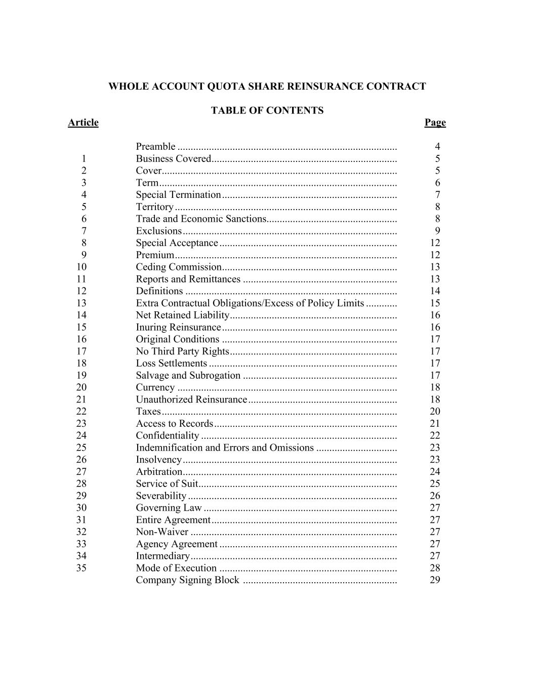 WHOLE ACCOUNT QUOTA SHARE REINSURANCE CONTRACT TABLE OF CONTENTS Article Page Preamble .................................................................................... 4 1 Business Covered ....................................................................... 5 2 Cover .......................................................................................... 5 3 Term ........................................................................................... 6 4 Special Termination ................................................................... 7 5 Territory ..................................................................................... 8 6 Trade and Economic Sanctions .................................................. 8 7 Exclusions .................................................................................. 9 8 Special Acceptance .................................................................... 12 9 Premium ..................................................................................... 12 10 Ceding Commission ................................................................... 13 11 Reports and Remittances ........................................................... 13 12 Definitions ................................................................................. 14 13 Extra Contractual Obligations/Excess of Policy Limits ............ 15 14 Net Retained Liability ................................................................ 16 15 Inuring Reinsurance ................................................................... 16 16 Original Conditions ................................................................... 17 17 No Third Party Rights ................................................................ 17 18 Loss Settlements ........................................................................ 17 19 Salvage and Subrogation ........................................................... 17 20 Currency .................................................................................... 18 21 Unauthorized Reinsurance ......................................................... 18 22 Taxes .......................................................................................... 20 23 Access to Records ...................................................................... 21 24 Confidentiality ........................................................................... 22 25 Indemnification and Errors and Omissions ............................... 23 26 Insolvency .................................................................................. 23 27 Arbitration .................................................................................. 24 28 Service of Suit ............................................................................ 25 29 Severability ................................................................................ 26 30 Governing Law .......................................................................... 27 31 Entire Agreement ....................................................................... 27 32 Non-Waiver ............................................................................... 27 33 Agency Agreement .................................................................... 27 34 Intermediary ............................................................................... 27 35 Mode of Execution .................................................................... 28 Company Signing Block ........................................................... 29
