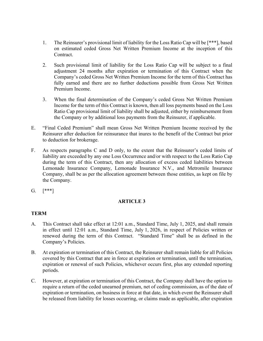 1. The Reinsurer’s provisional limit of liability for the Loss Ratio Cap will be [***], based on estimated ceded Gross Net Written Premium Income at the inception of this Contract. 2. Such provisional limit of liability for the Loss Ratio Cap will be subject to a final adjustment 24 months after expiration or termination of this Contract when the Company’s ceded Gross Net Written Premium Income for the term of this Contract has fully earned and there are no further deductions possible from Gross Net Written Premium Income. 3. When the final determination of the Company’s ceded Gross Net Written Premium Income for the term of this Contract is known, then all loss payments based on the Loss Ratio Cap provisional limit of liability shall be adjusted, either by reimbursement from the Company or by additional loss payments from the Reinsurer, if applicable. E. “Final Ceded Premium” shall mean Gross Net Written Premium Income received by the Reinsurer after deduction for reinsurance that inures to the benefit of the Contract but prior to deduction for brokerage. F. As respects paragraphs C and D only, to the extent that the Reinsurer’s ceded limits of liability are exceeded by any one Loss Occurrence and/or with respect to the Loss Ratio Cap during the term of this Contract, then any allocation of excess ceded liabilities between Lemonade Insurance Company, Lemonade Insurance N.V., and Metromile Insurance Company, shall be as per the allocation agreement between those entities, as kept on file by the Company. G. [***] ARTICLE 3 TERM A. This Contract shall take effect at 12:01 a.m., Standard Time, July 1, 2025, and shall remain in effect until 12:01 a.m., Standard Time, July 1, 2026, in respect of Policies written or renewed during the term of this Contract. “Standard Time” shall be as defined in the Company’s Policies. B. At expiration or termination of this Contract, the Reinsurer shall remain liable for all Policies covered by this Contract that are in force at expiration or termination, until the termination, expiration or renewal of such Policies, whichever occurs first, plus any extended reporting periods. C. However, at expiration or termination of this Contract, the Company shall have the option to require a return of the ceded unearned premium, net of ceding commission, as of the date of expiration or termination, on business in force at that date, in which event the Reinsurer shall be released from liability for losses occurring, or claims made as applicable, after expiration