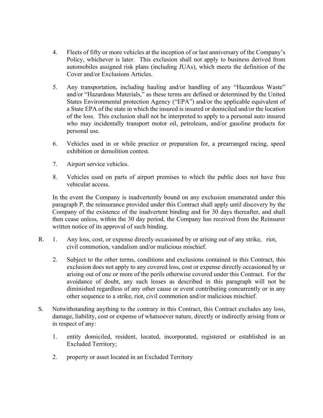 4. Fleets of fifty or more vehicles at the inception of or last anniversary of the Company’s Policy, whichever is later. This exclusion shall not apply to business derived from automobiles assigned risk plans (including JUAs), which meets the definition of the Cover and/or Exclusions Articles. 5. Any transportation, including hauling and/or handling of any “Hazardous Waste” and/or “Hazardous Materials,” as these terms are defined or determined by the United States Environmental protection Agency (“EPA”) and/or the applicable equivalent of a State EPA of the state in which the insured is insured or domiciled and/or the location of the loss. This exclusion shall not be interpreted to apply to a personal auto insured who may incidentally transport motor oil, petroleum, and/or gasoline products for personal use. 6. Vehicles used in or while practice or preparation for, a prearranged racing, speed exhibition or demolition contest. 7. Airport service vehicles. 8. Vehicles used on parts of airport premises to which the public does not have free vehicular access. In the event the Company is inadvertently bound on any exclusion enumerated under this paragraph P, the reinsurance provided under this Contract shall apply until discovery by the Company of the existence of the inadvertent binding and for 30 days thereafter, and shall then cease unless, within the 30 day period, the Company has received from the Reinsurer written notice of its approval of such binding. R. 1. Any loss, cost, or expense directly occasioned by or arising out of any strike, riot, civil commotion, vandalism and/or malicious mischief. 2. Subject to the other terms, conditions and exclusions contained in this Contract, this exclusion does not apply to any covered loss, cost or expense directly occasioned by or arising out of one or more of the perils otherwise covered under this Contract. For the avoidance of doubt, any such losses as described in this paragraph will not be diminished regardless of any other cause or event contributing concurrently or in any other sequence to a strike, riot, civil commotion and/or malicious mischief. S. Notwithstanding anything to the contrary in this Contract, this Contract excludes any loss, damage, liability, cost or expense of whatsoever nature, directly or indirectly arising from or in respect of any: 1. entity domiciled, resident, located, incorporated, registered or established in an Excluded Territory; 2. property or asset located in an Excluded Territory