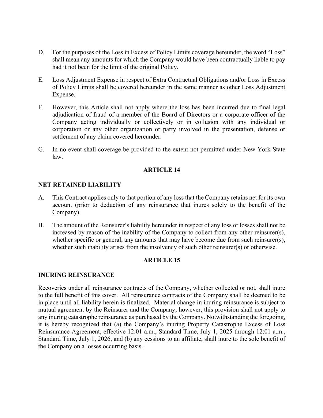 D. For the purposes of the Loss in Excess of Policy Limits coverage hereunder, the word “Loss” shall mean any amounts for which the Company would have been contractually liable to pay had it not been for the limit of the original Policy. E. Loss Adjustment Expense in respect of Extra Contractual Obligations and/or Loss in Excess of Policy Limits shall be covered hereunder in the same manner as other Loss Adjustment Expense. F. However, this Article shall not apply where the loss has been incurred due to final legal adjudication of fraud of a member of the Board of Directors or a corporate officer of the Company acting individually or collectively or in collusion with any individual or corporation or any other organization or party involved in the presentation, defense or settlement of any claim covered hereunder. G. In no event shall coverage be provided to the extent not permitted under New York State law. ARTICLE 14 NET RETAINED LIABILITY A. This Contract applies only to that portion of any loss that the Company retains net for its own account (prior to deduction of any reinsurance that inures solely to the benefit of the Company). B. The amount of the Reinsurer’s liability hereunder in respect of any loss or losses shall not be increased by reason of the inability of the Company to collect from any other reinsurer(s), whether specific or general, any amounts that may have become due from such reinsurer(s), whether such inability arises from the insolvency of such other reinsurer(s) or otherwise. ARTICLE 15 INURING REINSURANCE Recoveries under all reinsurance contracts of the Company, whether collected or not, shall inure to the full benefit of this cover. All reinsurance contracts of the Company shall be deemed to be in place until all liability herein is finalized. Material change in inuring reinsurance is subject to mutual agreement by the Reinsurer and the Company; however, this provision shall not apply to any inuring catastrophe reinsurance as purchased by the Company. Notwithstanding the foregoing, it is hereby recognized that (a) the Company’s inuring Property Catastrophe Excess of Loss Reinsurance Agreement, effective 12:01 a.m., Standard Time, July 1, 2025 through 12:01 a.m., Standard Time, July 1, 2026, and (b) any cessions to an affiliate, shall inure to the sole benefit of the Company on a losses occurring basis.