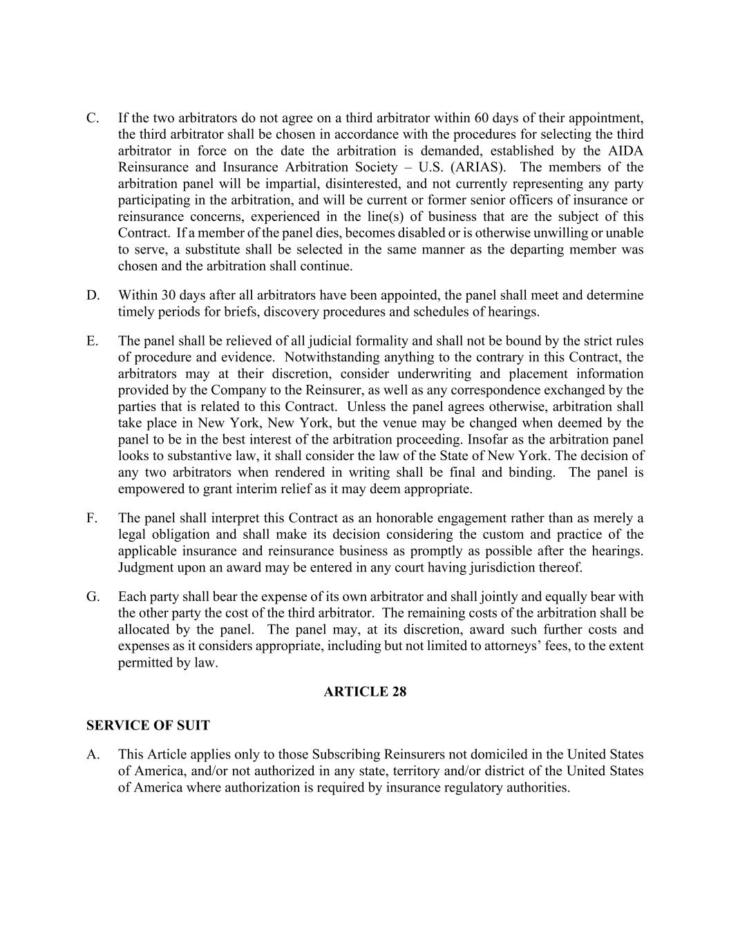 C. If the two arbitrators do not agree on a third arbitrator within 60 days of their appointment, the third arbitrator shall be chosen in accordance with the procedures for selecting the third arbitrator in force on the date the arbitration is demanded, established by the AIDA Reinsurance and Insurance Arbitration Society – U.S. (ARIAS). The members of the arbitration panel will be impartial, disinterested, and not currently representing any party participating in the arbitration, and will be current or former senior officers of insurance or reinsurance concerns, experienced in the line(s) of business that are the subject of this Contract. If a member of the panel dies, becomes disabled or is otherwise unwilling or unable to serve, a substitute shall be selected in the same manner as the departing member was chosen and the arbitration shall continue. D. Within 30 days after all arbitrators have been appointed, the panel shall meet and determine timely periods for briefs, discovery procedures and schedules of hearings. E. The panel shall be relieved of all judicial formality and shall not be bound by the strict rules of procedure and evidence. Notwithstanding anything to the contrary in this Contract, the arbitrators may at their discretion, consider underwriting and placement information provided by the Company to the Reinsurer, as well as any correspondence exchanged by the parties that is related to this Contract. Unless the panel agrees otherwise, arbitration shall take place in New York, New York, but the venue may be changed when deemed by the panel to be in the best interest of the arbitration proceeding. Insofar as the arbitration panel looks to substantive law, it shall consider the law of the State of New York. The decision of any two arbitrators when rendered in writing shall be final and binding. The panel is empowered to grant interim relief as it may deem appropriate. F. The panel shall interpret this Contract as an honorable engagement rather than as merely a legal obligation and shall make its decision considering the custom and practice of the applicable insurance and reinsurance business as promptly as possible after the hearings. Judgment upon an award may be entered in any court having jurisdiction thereof. G. Each party shall bear the expense of its own arbitrator and shall jointly and equally bear with the other party the cost of the third arbitrator. The remaining costs of the arbitration shall be allocated by the panel. The panel may, at its discretion, award such further costs and expenses as it considers appropriate, including but not limited to attorneys’ fees, to the extent permitted by law. ARTICLE 28 SERVICE OF SUIT A. This Article applies only to those Subscribing Reinsurers not domiciled in the United States of America, and/or not authorized in any state, territory and/or district of the United States of America where authorization is required by insurance regulatory authorities.
