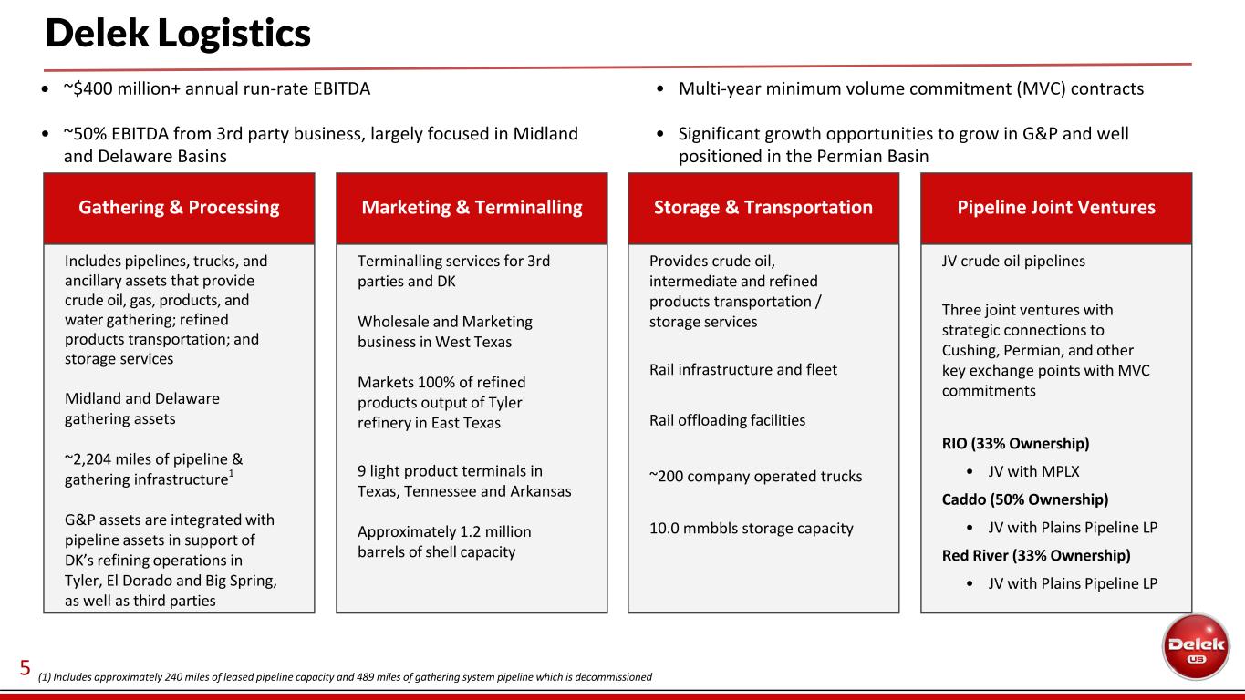 The logistics operations include Delek Logistics Partners, LP (NYSE: DKL). Delek Logistics Partners, LP is a growth-oriented master limited partnership focused on owning and operating midstream energy infrastructure assets. Delek US Holdings, Inc. and its subsidiaries owned approximately 72.7% (including the general partner interest) of Delek Logistics Partners, LP at March 31, 2024.